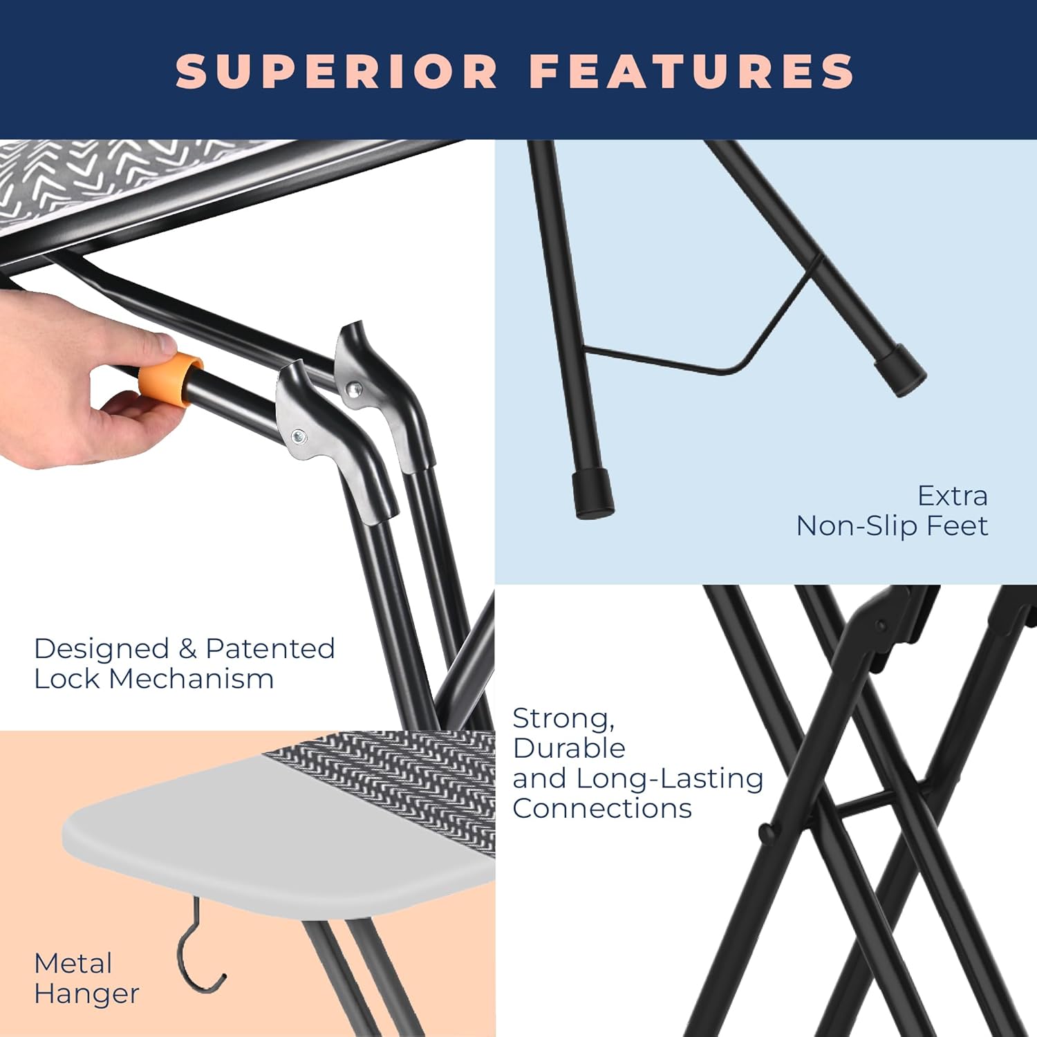 - SOLID STEEL FRAME NON-SKID LEGS - Wobble-Free Stability: Not another China wobbling board! Solid steel frame with non-skid legs provides rock-solid stability, protecting floors from scratches.