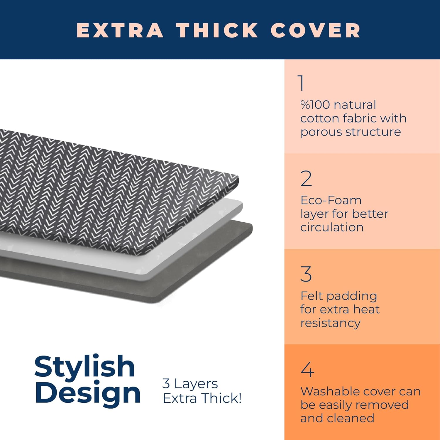 - EXTRA THICK 4-LAYER BOARD COVER PAD Ultimate Durability Smooth Ironing: 4-layer ironinh board cover with a blend of foam, felt, and fabric ensures smooth ironing without sticking The extra thick 100% cotton Heat-resistant surface keeps clothes safe.