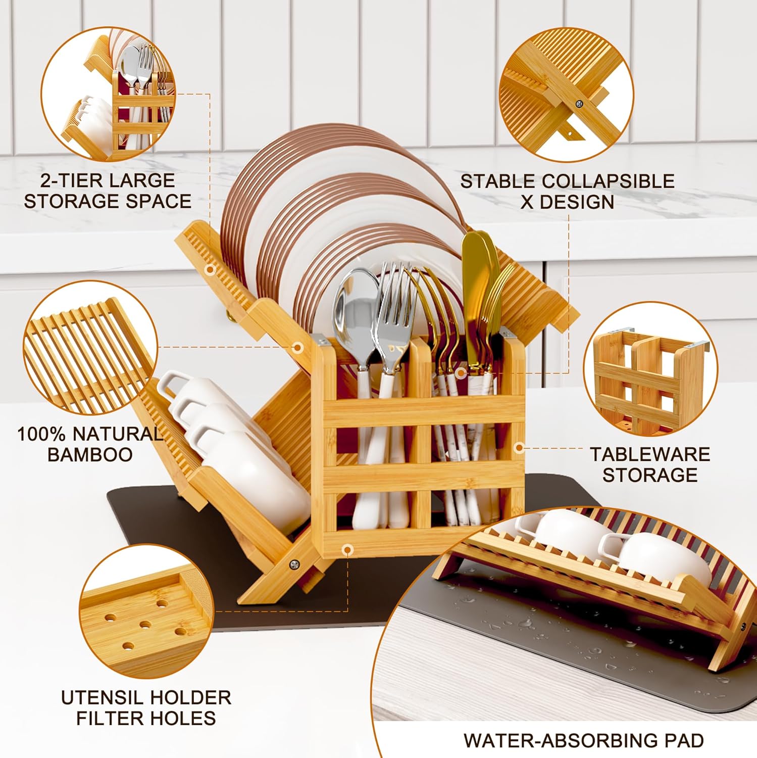 Greenual Bamboo Dish Drying Rack with Utensil Holder, 2 Tier Collapsible Dish Rack, Wooden Dish Racks for Kitchen Counter, Folding Drying Holder with Absorbent Dish Drying Mat