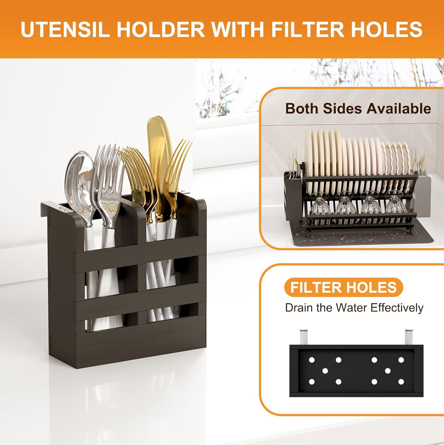 - Utensil Holder: Size: 5.91ββΓ2.36ββΓ5.98ββ. The utensil rack is a handy organizer that holds flatware and cooking utensils which can be hung oneither side of the bamboo dish drying rack for kitchen counter with metal hooks. Reliable and strong, will not fall. You can put knives and forks. Our utensil holder can hold 20+ knives, forks and spoons, or cleaning brushes. Filter holes on the bottom drain the water effectively