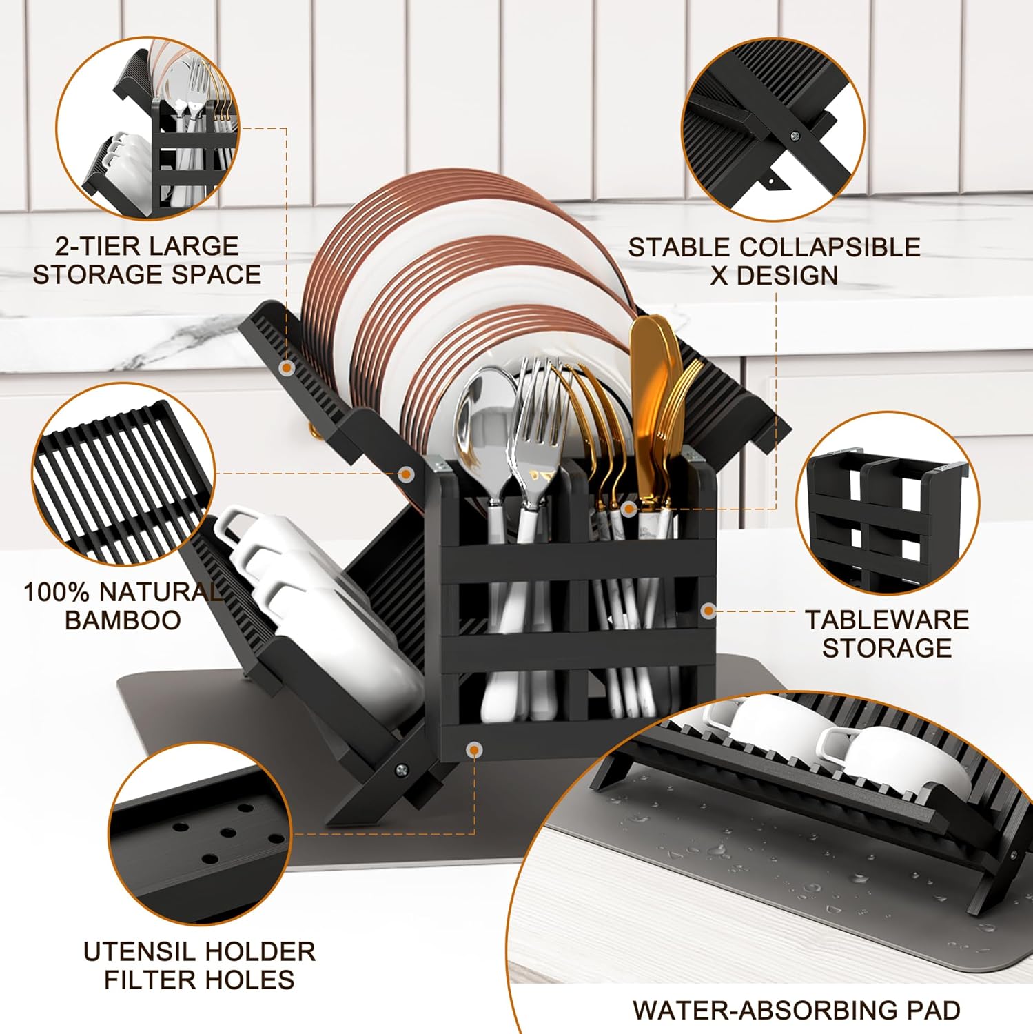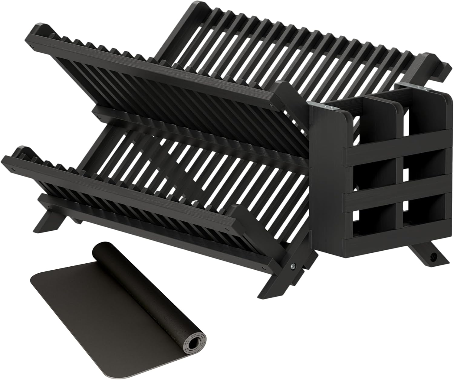 Greenual Black Bamboo Dish Drying Rack with Utensil Holder, 2 Tier Collapsible Dish Rack, Wooden Dish Racks for Kitchen Counter, Folding Drying Holder with Absorbent Dish Drying Mat