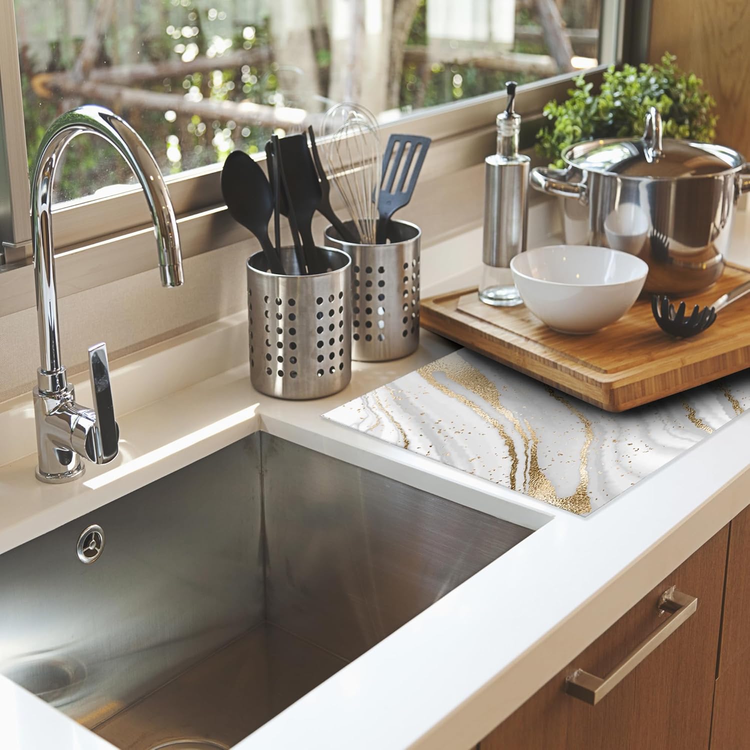 - MULTI-FUNCTIONAL: You can let it catches drips under a dish drying rack to keep the counter dry and clean, or you can place bottles, pots, pans, plates, bowls, cups, knives, silverware, serve ware, glassware, stemware, tableware and so on directly on the mat.