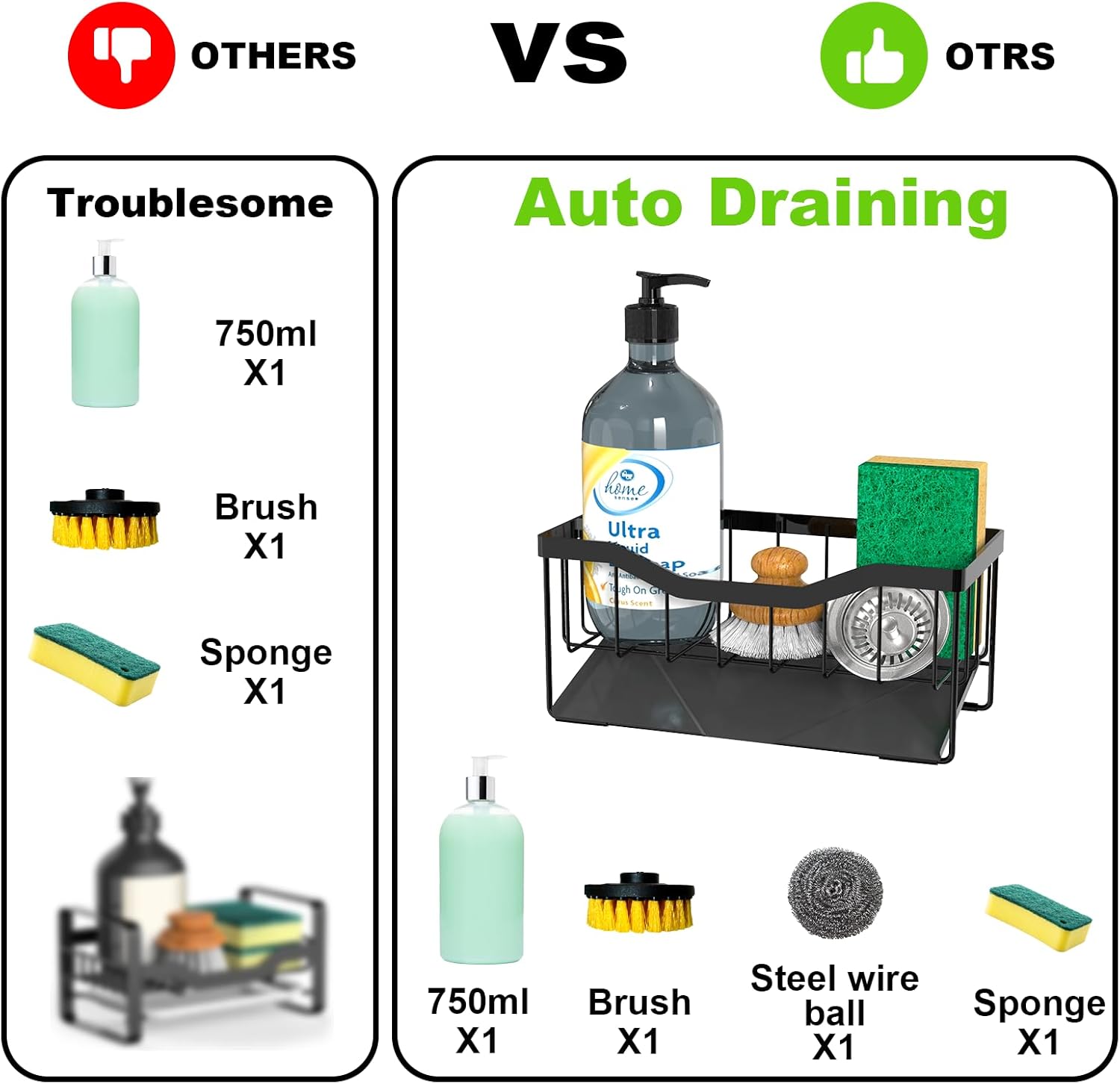 Vanwood Sponge Holder for Kitchen Sink with Auto Draining Tray, Sink Caddy Kitchen Sink Cocina Organizer, Self Drain Dish Soap Sponge Caddy for Counter
