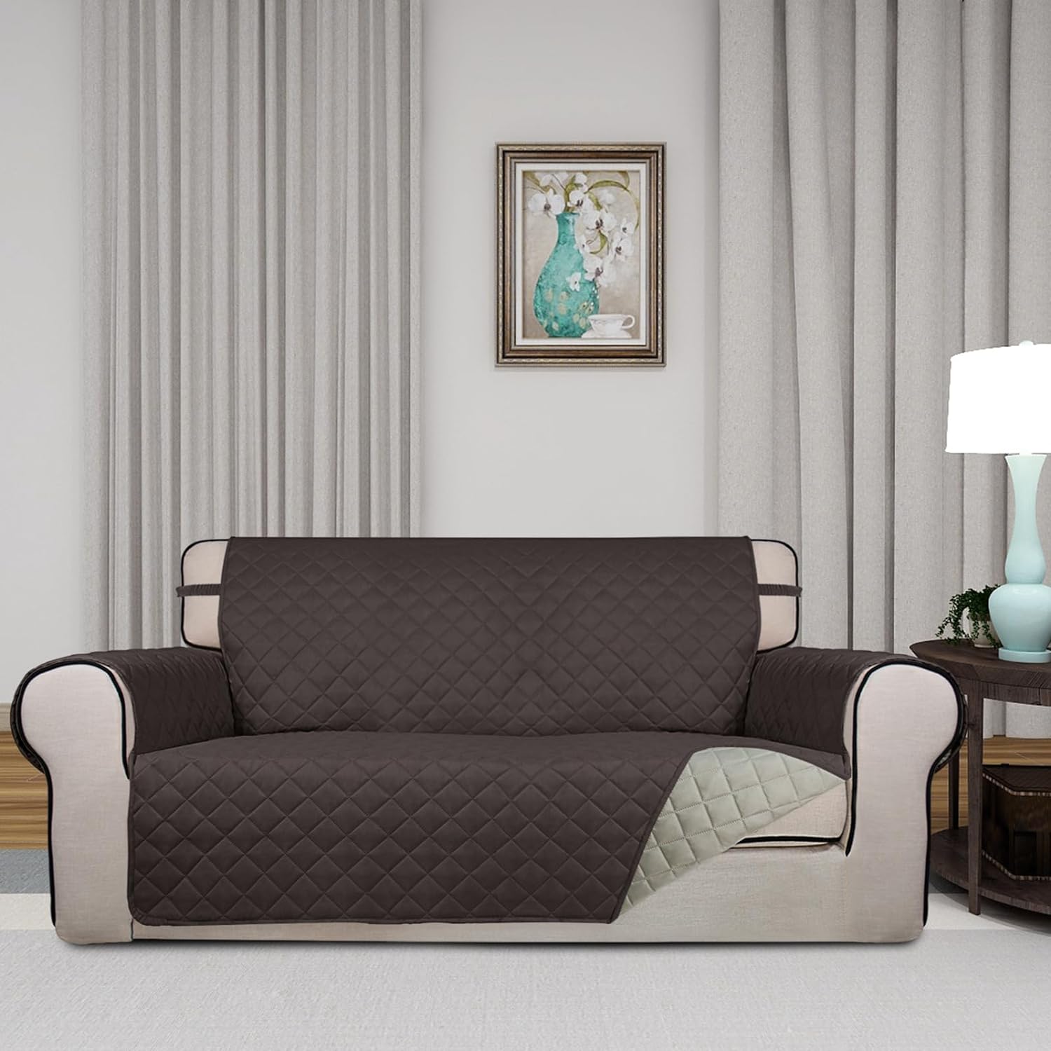 PureFit Reversible Quilted Sofa Cover, Water Resistant Slipcover Furniture Protector, Washable Couch Cover with Non Slip and Elastic Straps for Kids, Dogs, Pets (Oversized Loveseat, Chocolate/Beige)