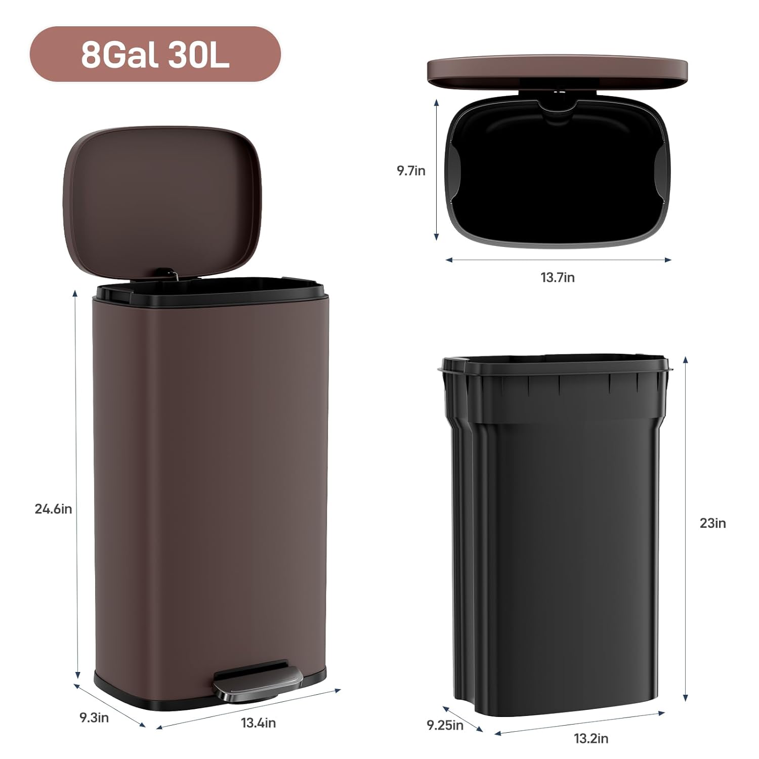 Arlopu 8 Gallon Step Trash Can, Stainless Steel Garbage Bin, Soft-Close Rubbish Bin with Removable Plastic Inner Bucket, Fingerprint-Proof, Lid Dustbin, Suit for Kitchen Home (Brown, 30L)