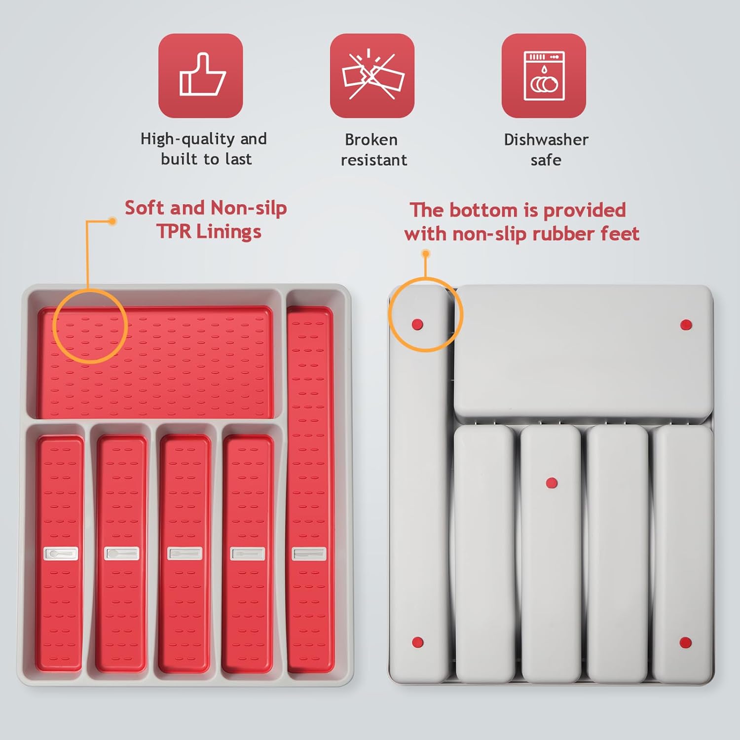 - 6-Compartment Flatware Organizer With Cutlery Icons:Still keeping your cutlery cluttered in your kitchen drawer?This cutlery tray with cutlery icons will really help you!It provides the perfect habitat for knives, forks and spoons and other kitchen necessities, and comes with icons to help you better store and sort,with this you will find that your kitchen drawers will be neat and organized.