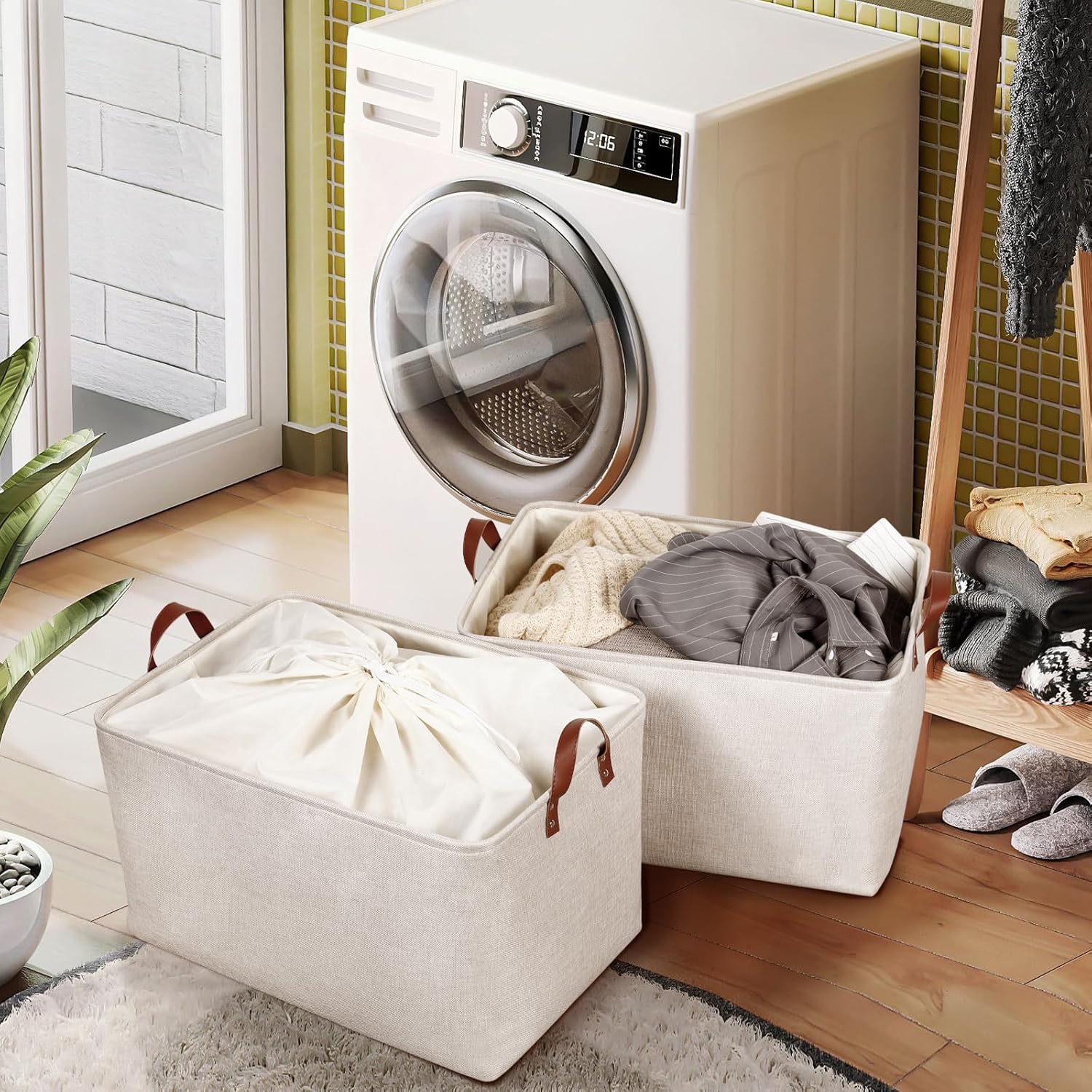 DULLEMELO Large Beige Storage Basket 70L Oversized Canvas Fabric Storage Bin, Collapsible Rectangular Toys Basket Organizer with Handles, 22X15 Storage Container for Clothes, Blankets, Pillows