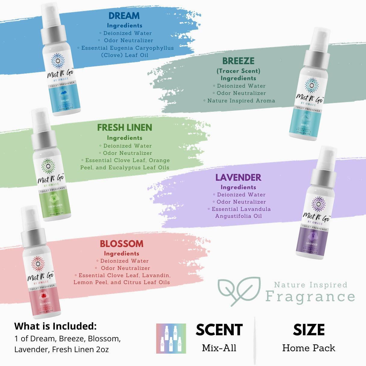 Mist N' Go by Omaze Travel Toilet Odor Eliminator - Air Freshener Spray for Bathroom Deodorizer - Mix All, Regular Size (2oz x5)