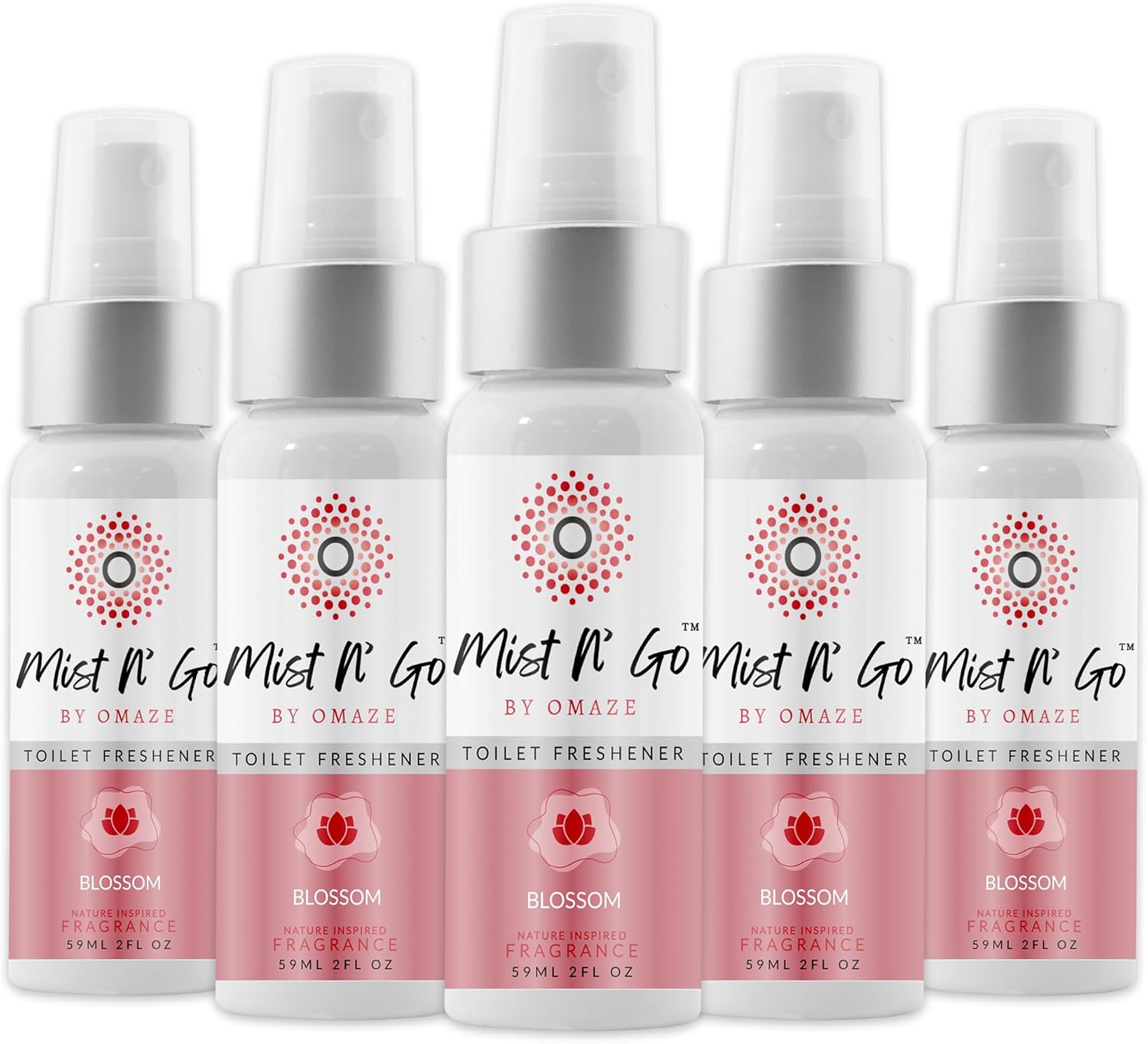 Mist N’ Go by Omaze Travel Bathroom Spray for Toilet Spray Odor Eliminator - Travel Toilet Spray for Bathroom Air Freshener Spray for Bathroom Deodorizer - Blossom Regular Size (2oz x5)