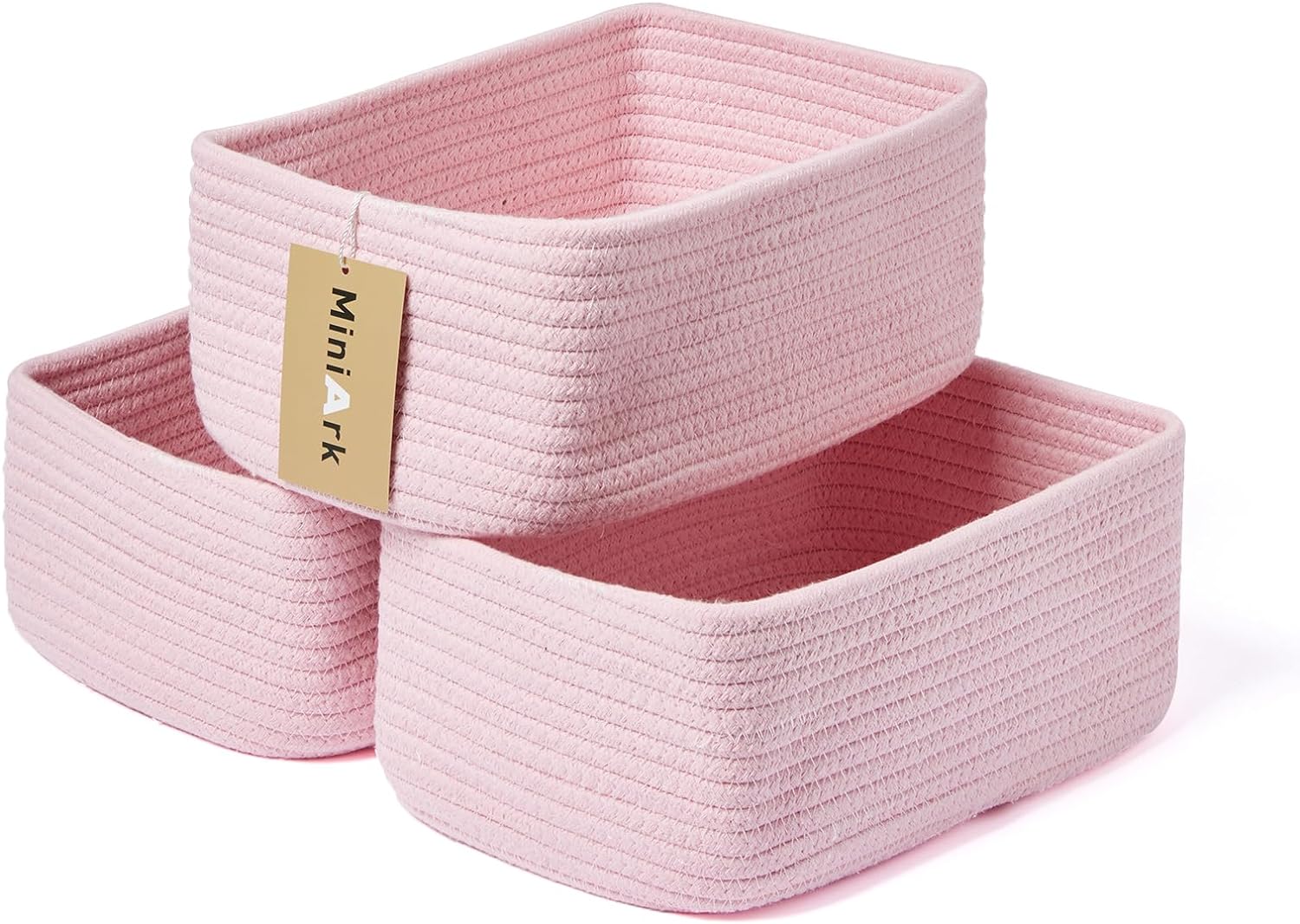 Small Storage Baskets for Organizing | Closet Organizer Bins | Shelf Toy Basket | Woven Rope Baskets | Cube Decorative Box | Shallow Basket | 11.5x7.5x4.7” | 3 Packs Pink
