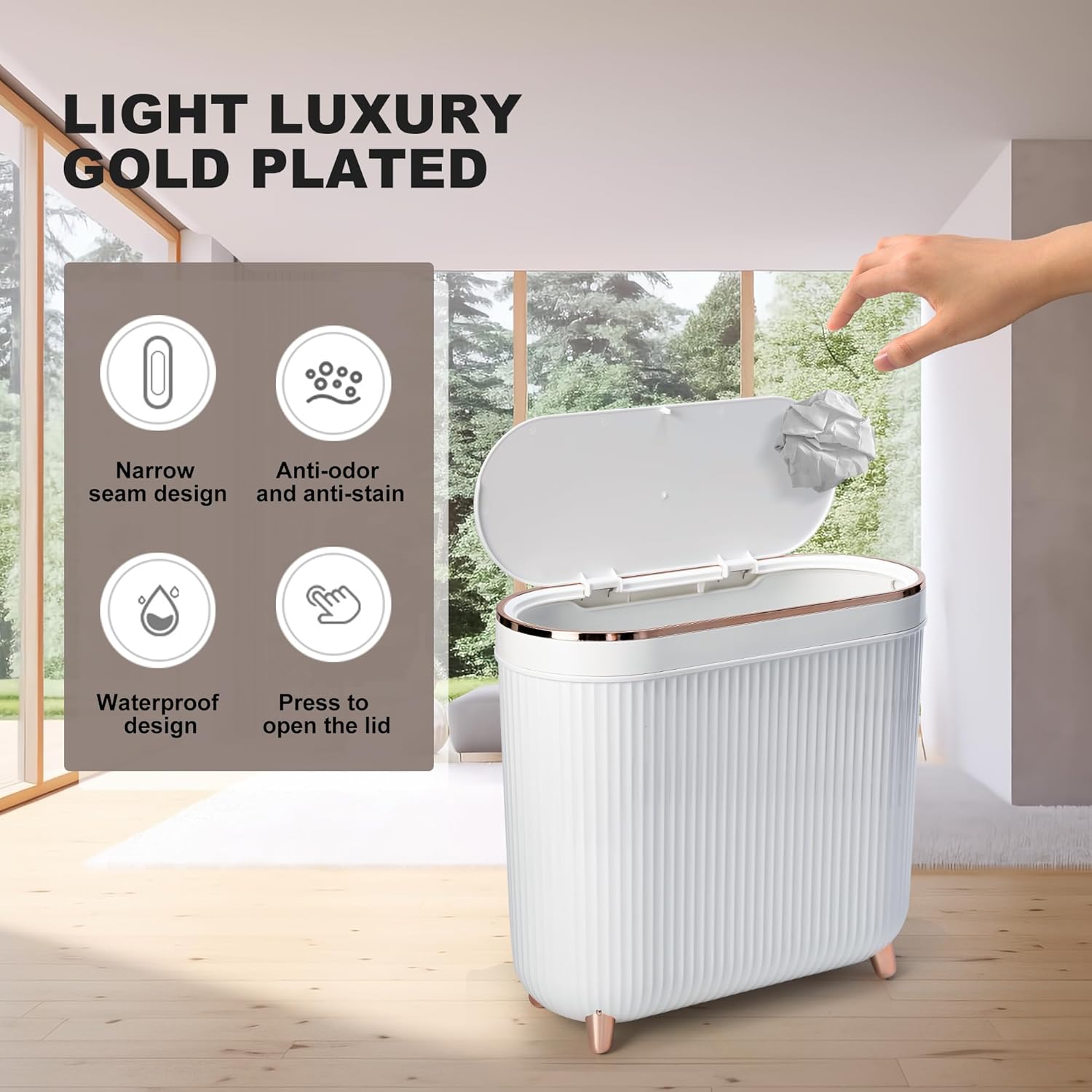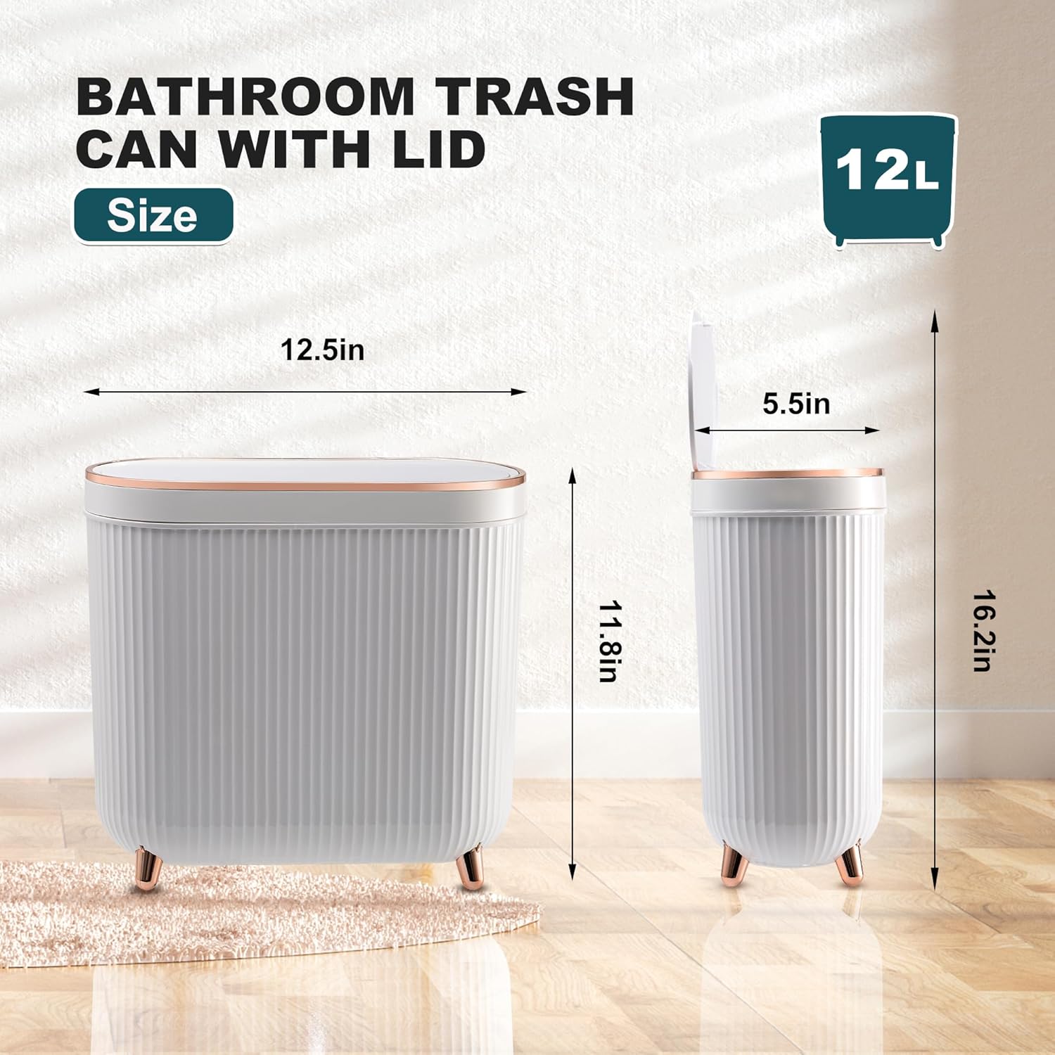 Bathroom Trash Can with Lid 3.2 Gallon Narrow Trash Can Small Plastic Trash Bin 12 Liter Rectangular Plastic Garbage Can with Press Type Lid for Bedroom Bathroom Milk White