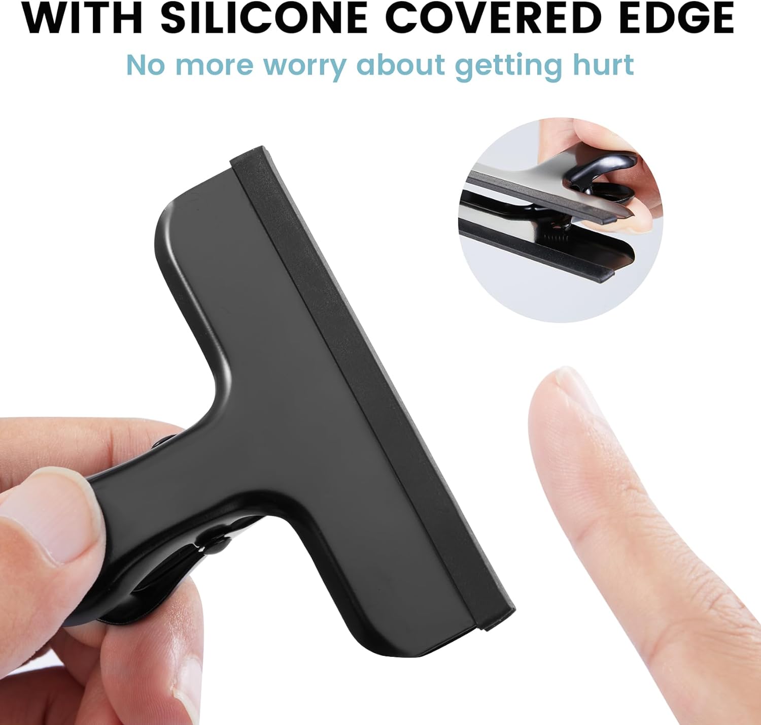 HOUSE AGAIN 12 Pack Stainless Steel Chip Bag Clips Covered with Silicone - NO More Sharp Edges - Color Coded for Food Bags - Air Tight Seal, Heavy Duty for Kitchen and Office, 3 Inches Wide, Black
