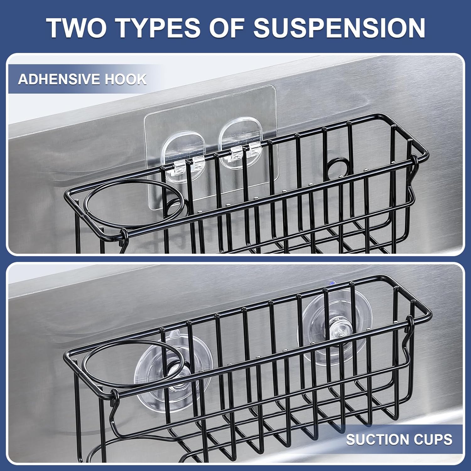 3-In-1 Sponge Holder for Kitchen Sink, 2 Type Suspension Options (Suction Cups & Adhesive Hook), Hanging Sink Caddy Organizer Rack - Sponge, Dish Cloth, Brush, Scrubber, 304 Stainless Steel - Black