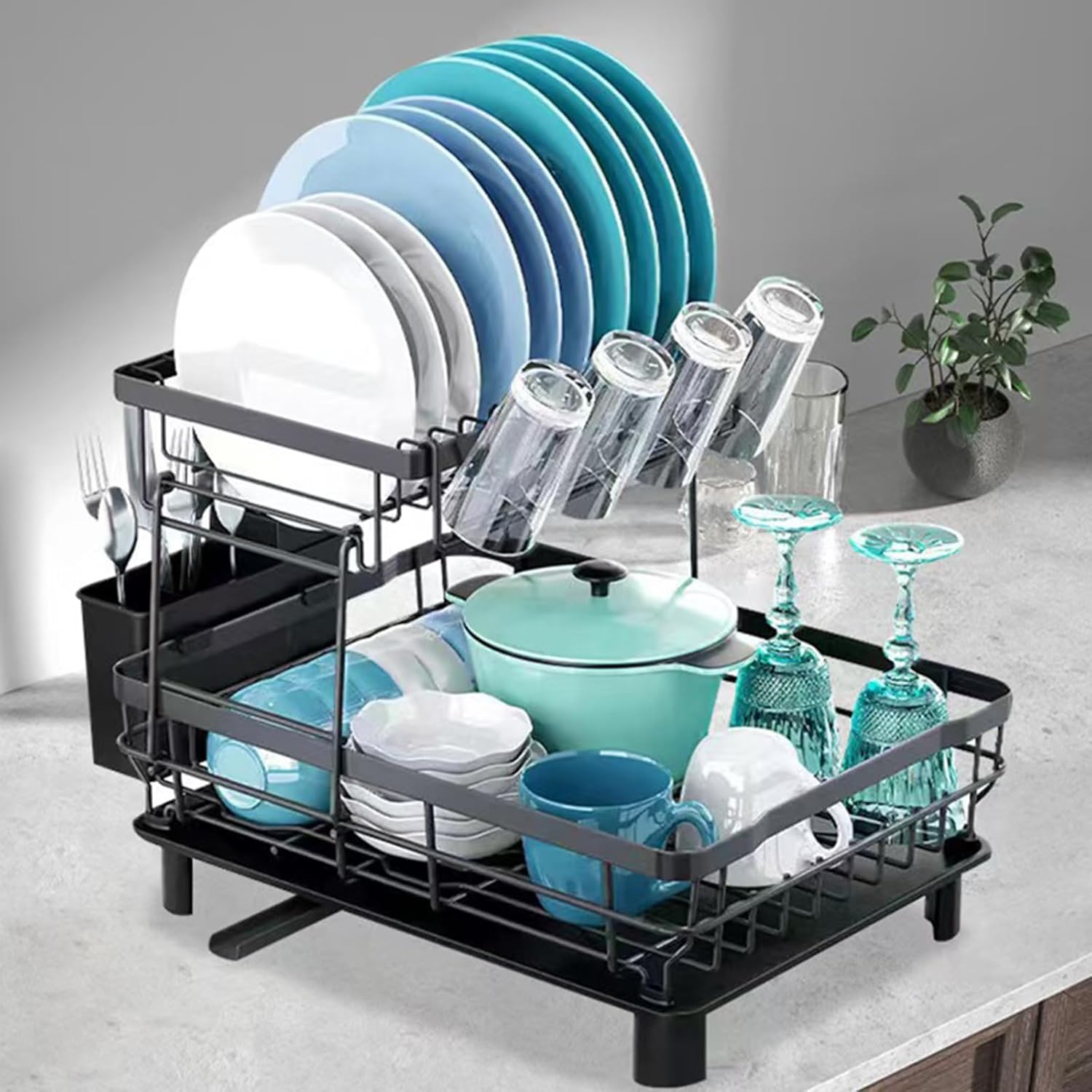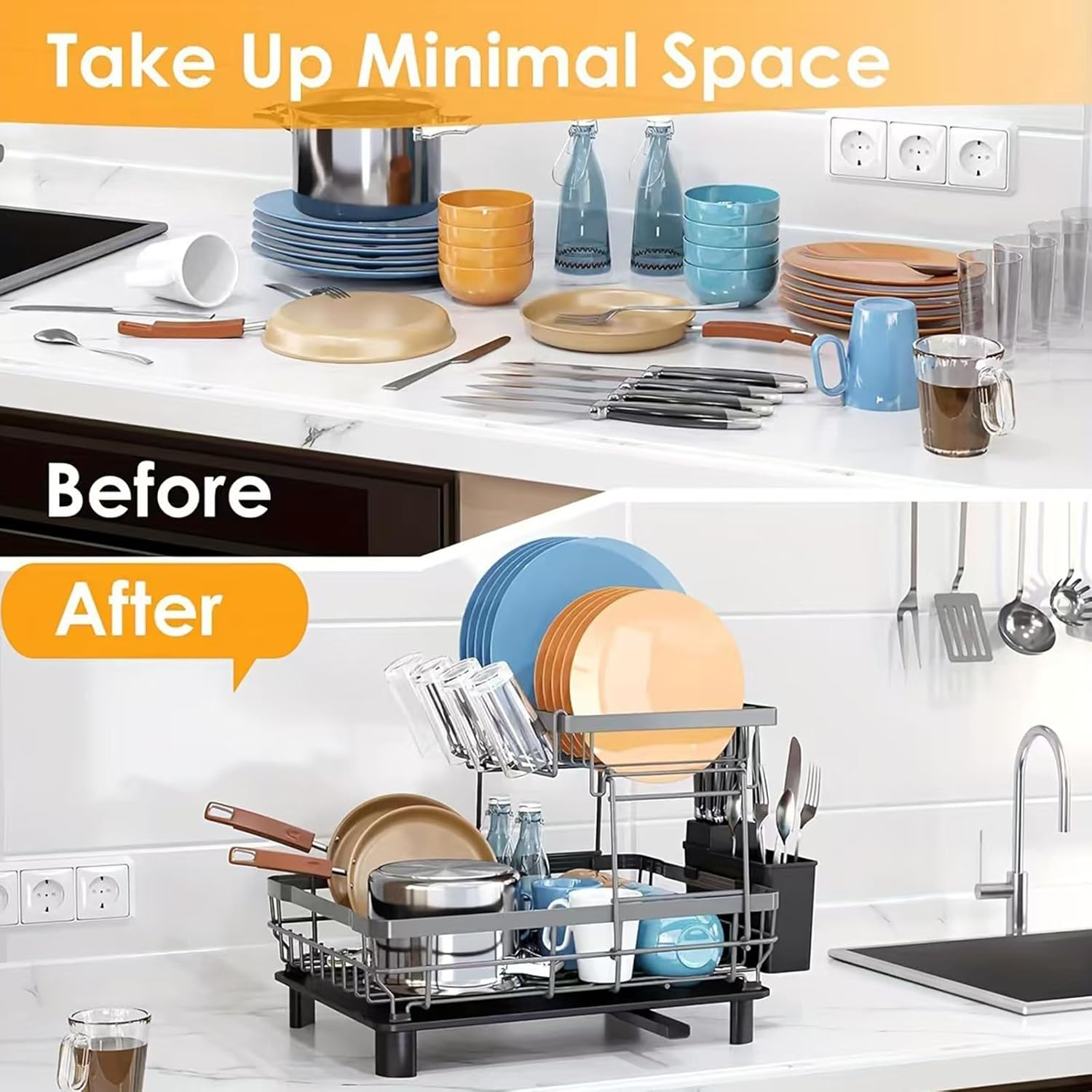 Dish Drying Rack, Space Saving & Durable, Rust-Proof Large 2 Tier Stainless Steel Dish Racks for Kitchen Counter with Cutlery & Cup Holder & Drainboard -Grey