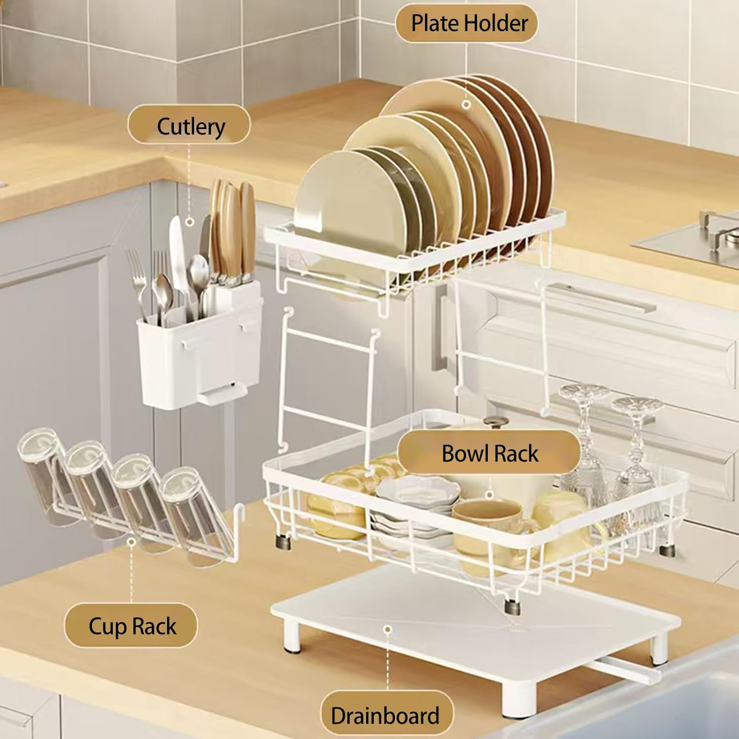 Dish Drying Rack, Space Saving & Durable, Rust-Proof Large 2 Tier Stainless Steel Dish Racks for Kitchen Counter with Cutlery & Cup Holder & Drainboard -White
