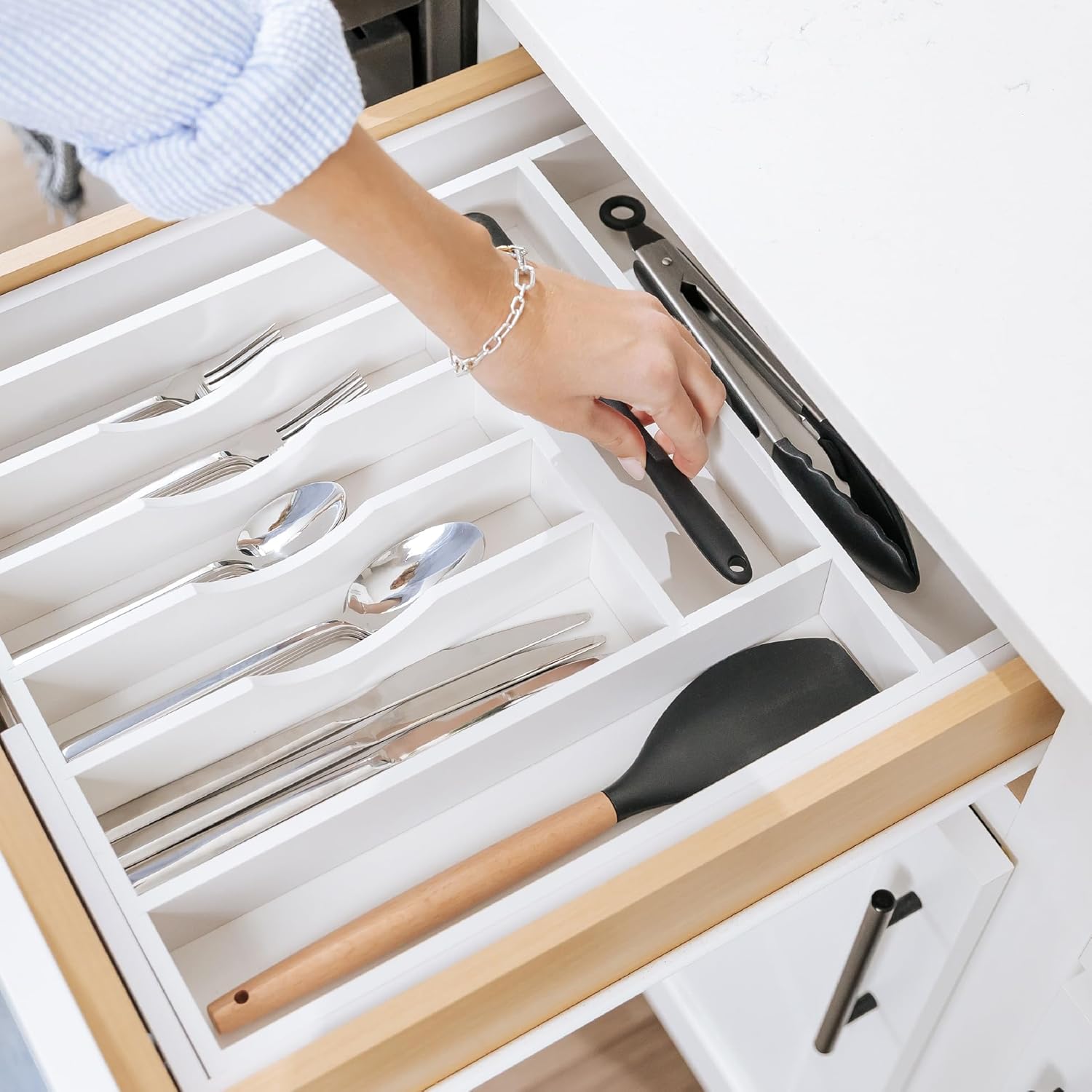 - MAXIMIZE YOUR DRAWERβS STORAGE CAPACITY: This 10-compartment (8 fixed + 2 adjustable) white organizer measures 17.4β long x 2.7β tall and expands from 14.5β to 25β wide (and any width in between). Most other bamboo organizers expand to 22β wide and are only 2β tall. Itβs amazing how much storage capacity an extra 0.7β in height adds when filling your organizer full of flatware and utensils!