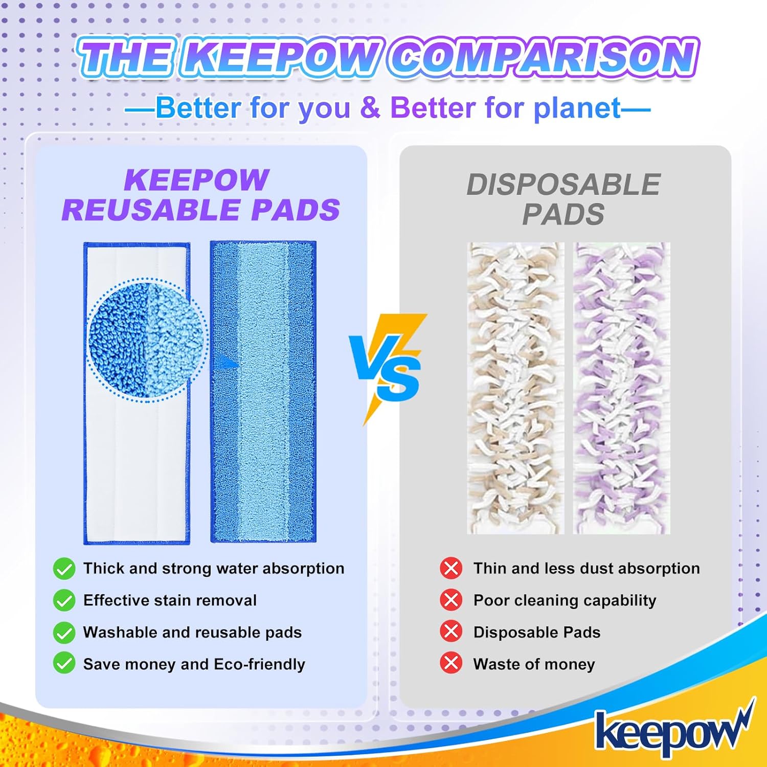 - 【SAVE MONEY & REDUCE WASTE】Stop wasting money on disposable pads and help reduce environmental waste by using these reusable powermop pads that replace hundreds of disposable refills, making it easy to keep your floors clean while saving money. You needn't rely on expensive disposable mop cloths any more. Just choose KEEPOW mop pads refills, save a lot of money for you every year and reduce waste for the earth.