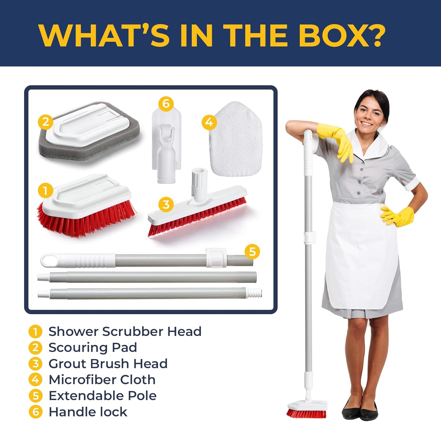 - COMPLETE CLEANING PACKAGE- Each purchase includes 3 Iron poles, 1 grout brush head, 1 tub scrubber brush head, 1 scouring pad and 1 microfiber cloth providing you with a comprehensive solution to maintaining a pristine bathroom using a reliable and efficient shower and tile cleaning brush