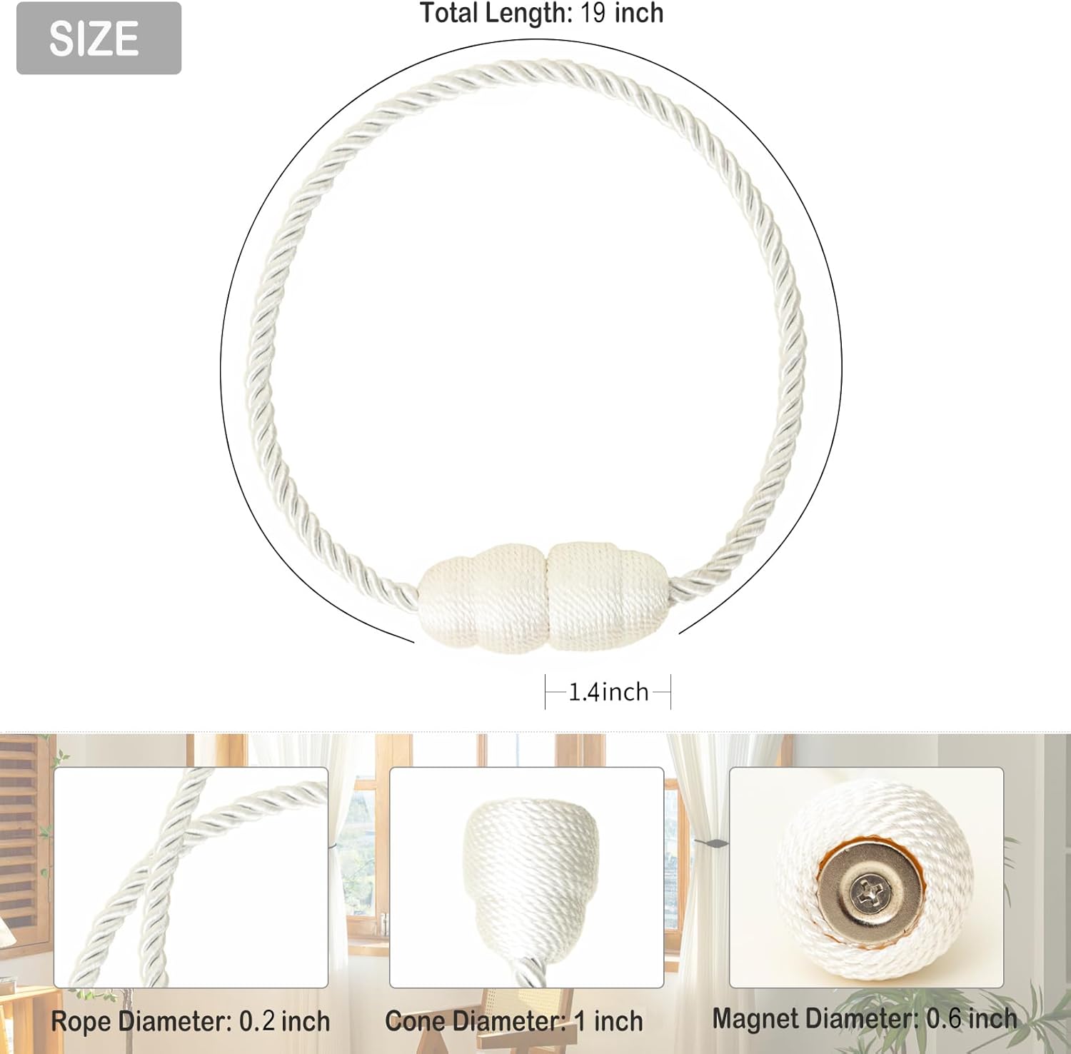 Magnetic Curtain Tiebacks - Rope Tie Backs for Curtains & Drapes - Decorative Window Holdbacks (6 Pack, White)