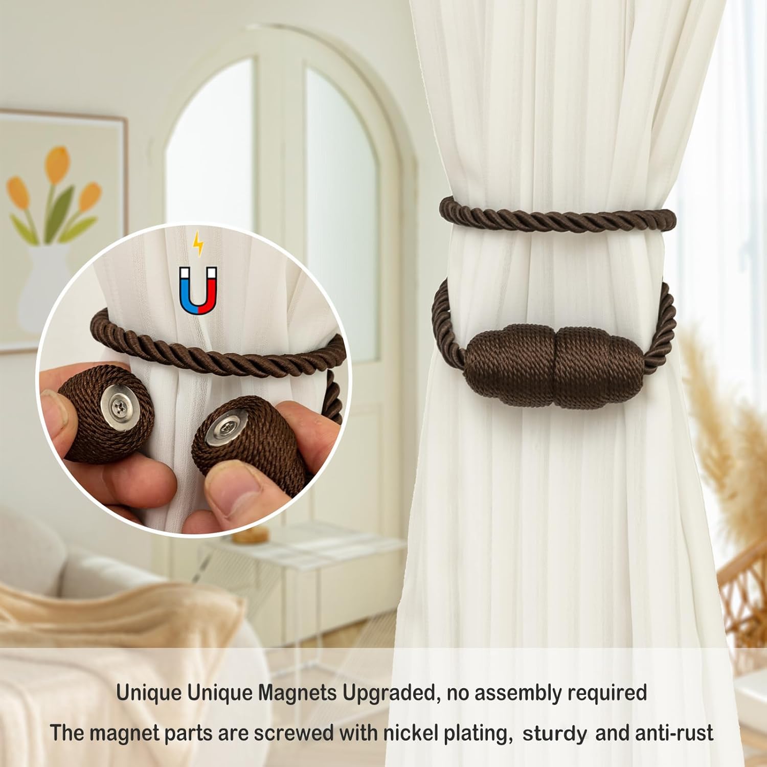 Magnetic Curtain Tiebacks Rope Curtain Tie Backs for Curtains 8 Pack Curtain Holders for Drapes Decorative Window Curtain Holdbacks, Coffee