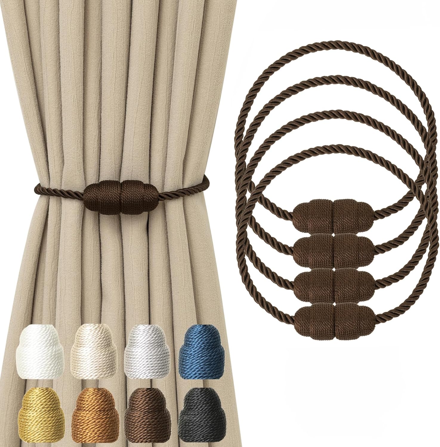 Magnetic Curtain Tiebacks Rope Tie Backs 4 Pack Decorative Window Holdbacks, Coffee
