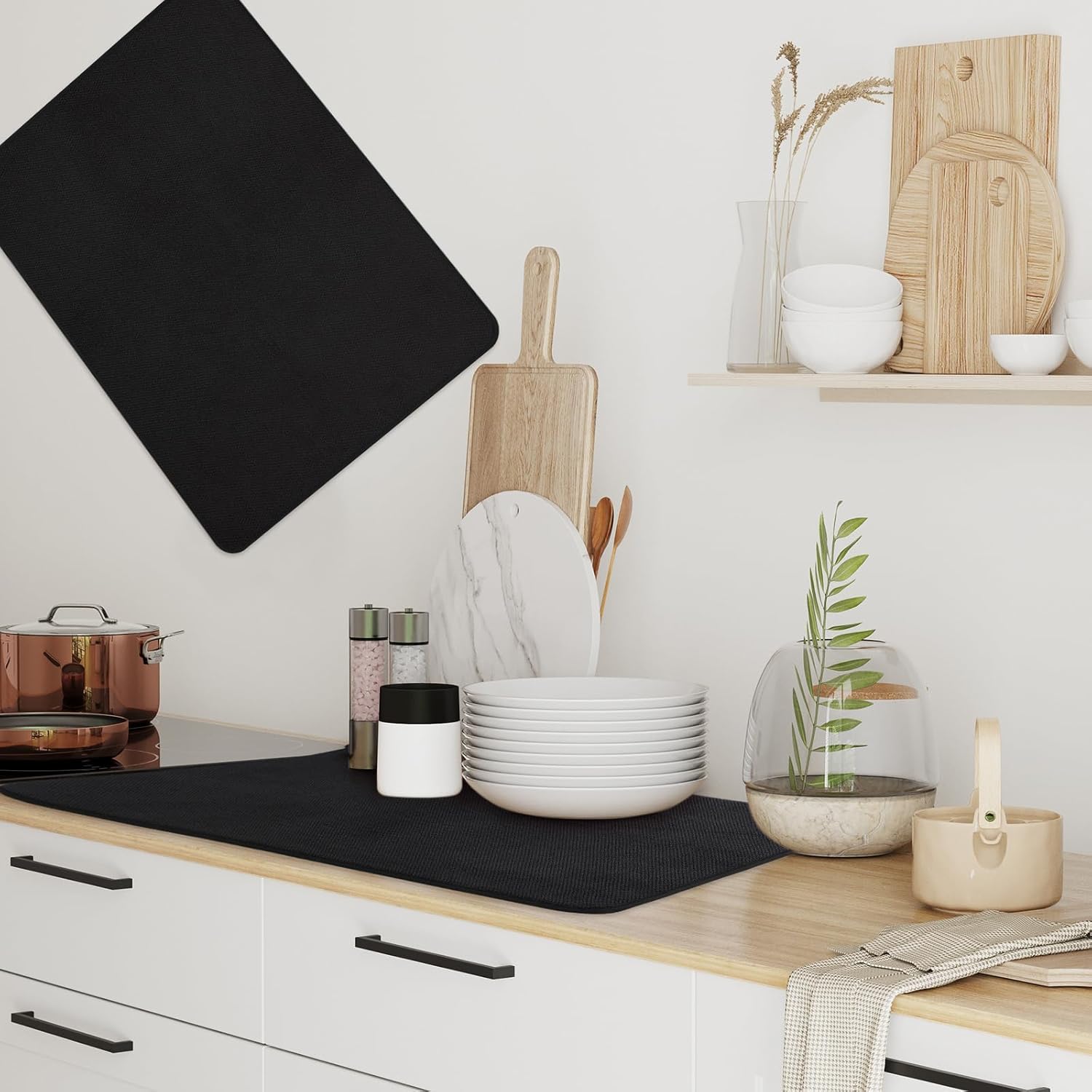 - Reliable Material and Attractive Design: get the ideal balance of functionality and style with our kitchen drying mats for dishes; Made from microfiber, these mats exhibit impressive water absorbent property, ensuring a dry, clean countertop; Their pleasing black color will effortlessly blend with most kitchen interior, enhancing its aesthetics