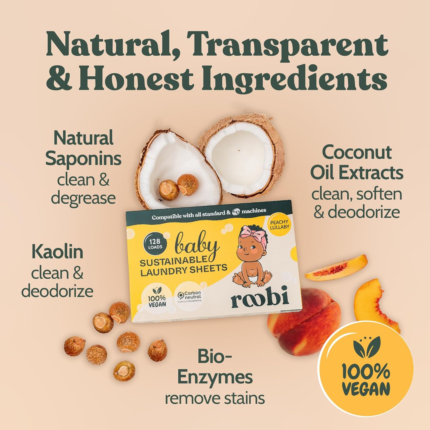Roobi Baby Laundry Detergent Sheets. Specially Formulated for Sensitive Skin. Newborns, Infants & Toddlers Clothes. Peachy Lullaby Scent. Up to 128 Loads