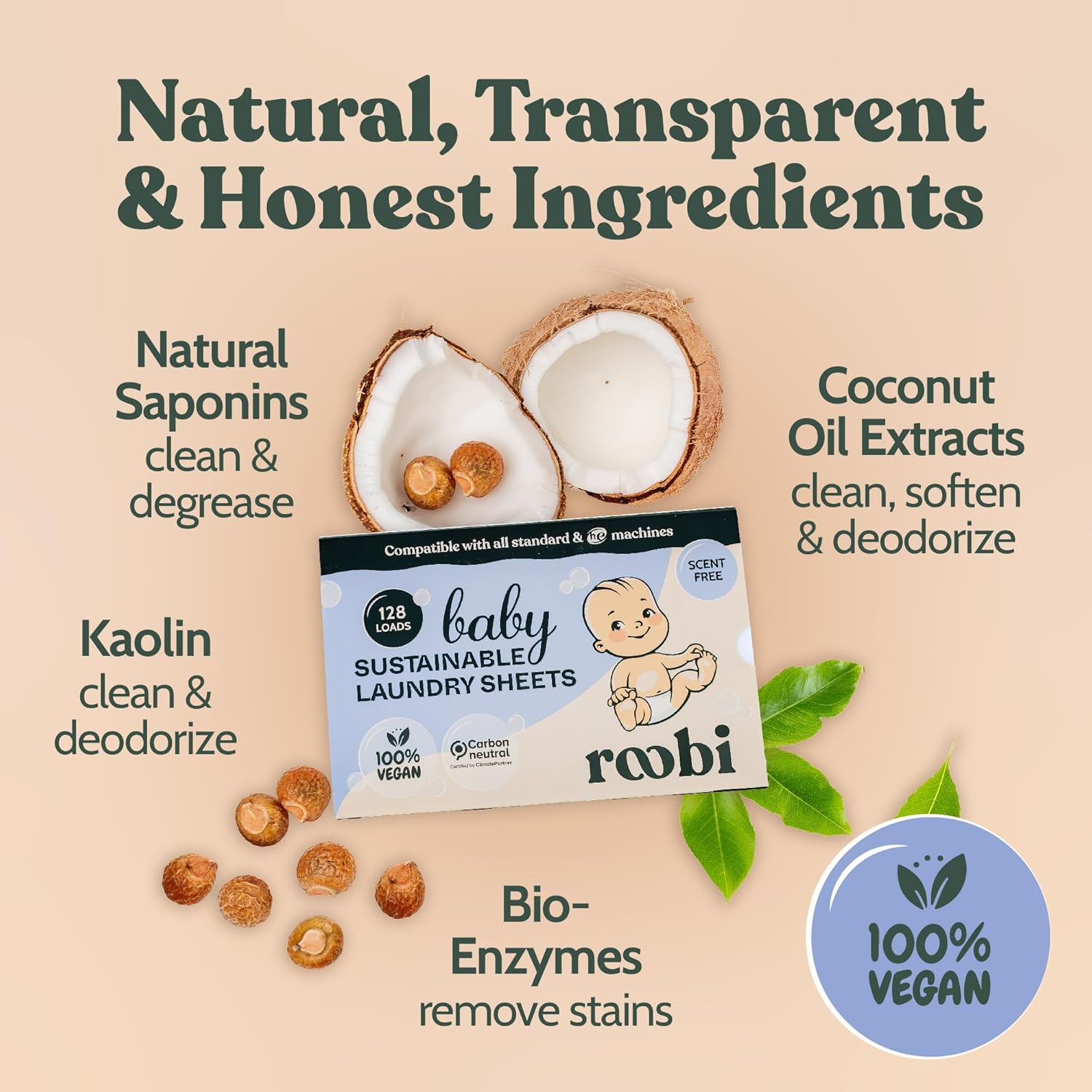 - NO IRRITATION OR RASHES: Roobi Baby Laundry Detergent Sheets are carefully designed to meet the gentle requirements of the baby's sensitive skin. Our allergy-friendly laundry detergent sheets are free from harsh chemicals, paraben, and phosphate. Our 100% vegan and plant-based formula is not just kind to the environment but also to your baby's skin, ensuring no irritations or rashes.