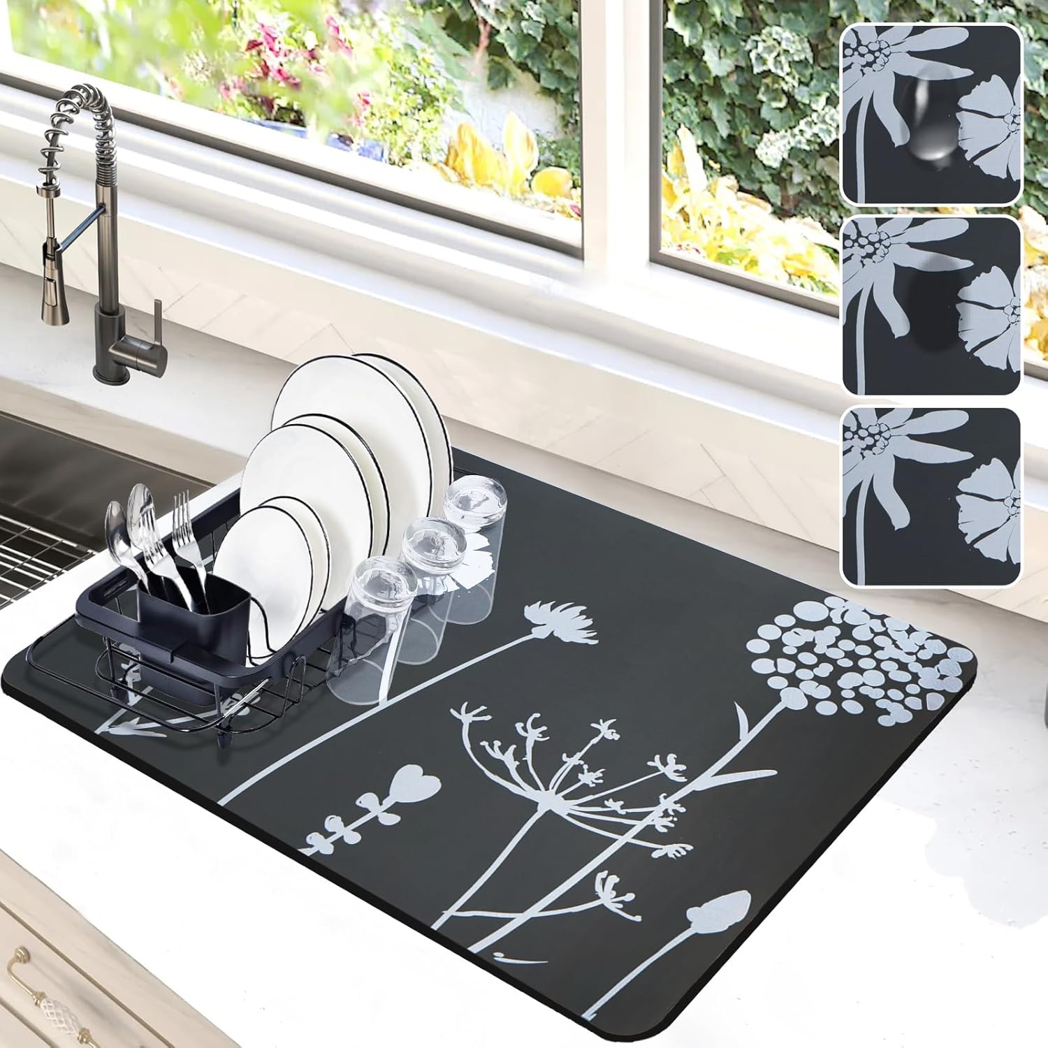 Dish Drying Mat for Kitchen Counter, 12"x19"Dish Drying Pad with Non-slip Rubber Backed, Hide Stain Anti Absorbent for Kitchen Counter, Drying Mat for Coffee Machine Dish Rack (Gray Daisy)