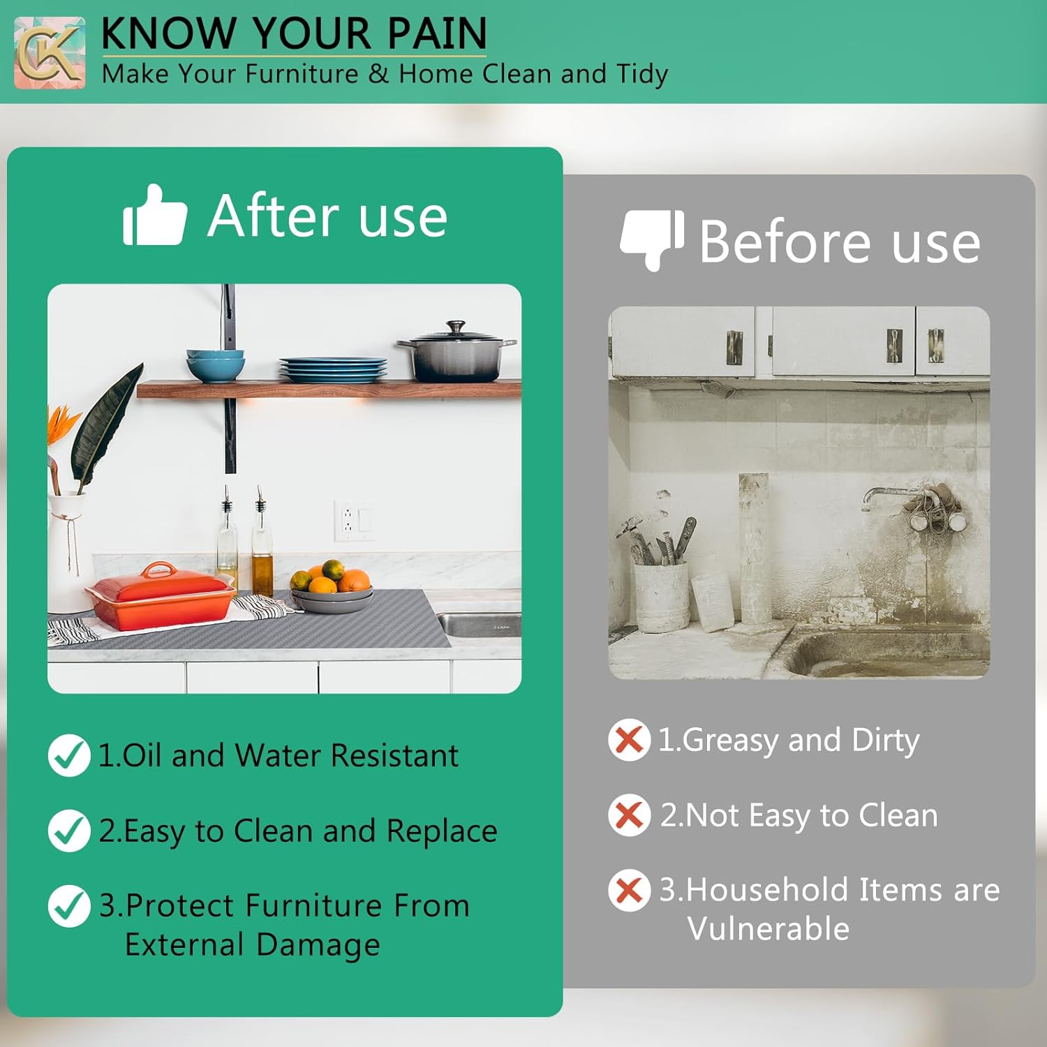 - Versatility: Shelf liner can be used in various areas of your home, including the kitchen, bathroom, laundry room, garage, and more.Self adhesive kitchen mats can be placed on kitchen countertops to provide anti-scratch and heat protection, preventing the countertop from being scratched or burned. Placed dining table to protect it from scratches and stains from food, cutlery and cups.