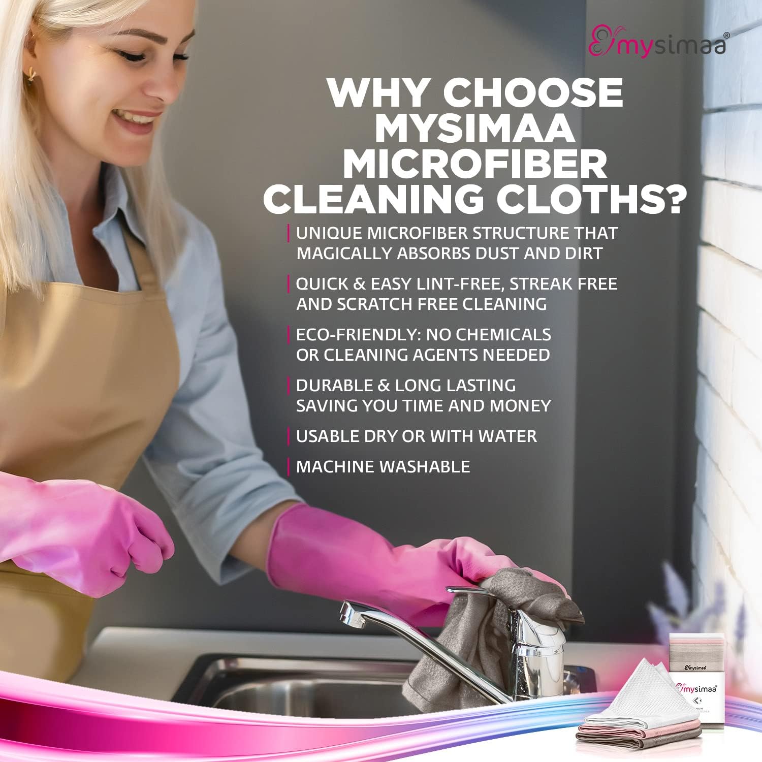 - LARGER THAN NORMAL MICROFIBER CLOTHS: Our cloths are nearly 16 inches by 16 inches so there is plenty of room to soak up water - and still leave room on the cloth to use to dry off. At Mysimaa, we're cleaning experts and have thought about what we'd like to see if we had the opportunity to design our own cleaning cloths. Hope you like the design too!