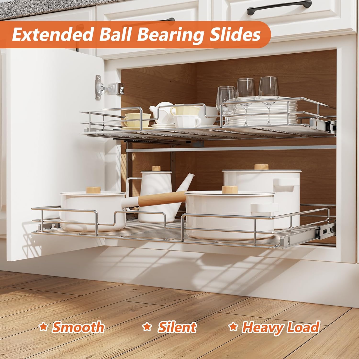 - 【Space-saving Pull Out Cabinet Organizer】This slide out cabinet organizer can maximize your cabinet space. Makes it super easy to store, organize, and access your stand mixers, pots, pans, baking sheets and other kitchen accessories, cleaning supplies, and various odds and ends. Now your cabinet is no longer just stacks of potspans.