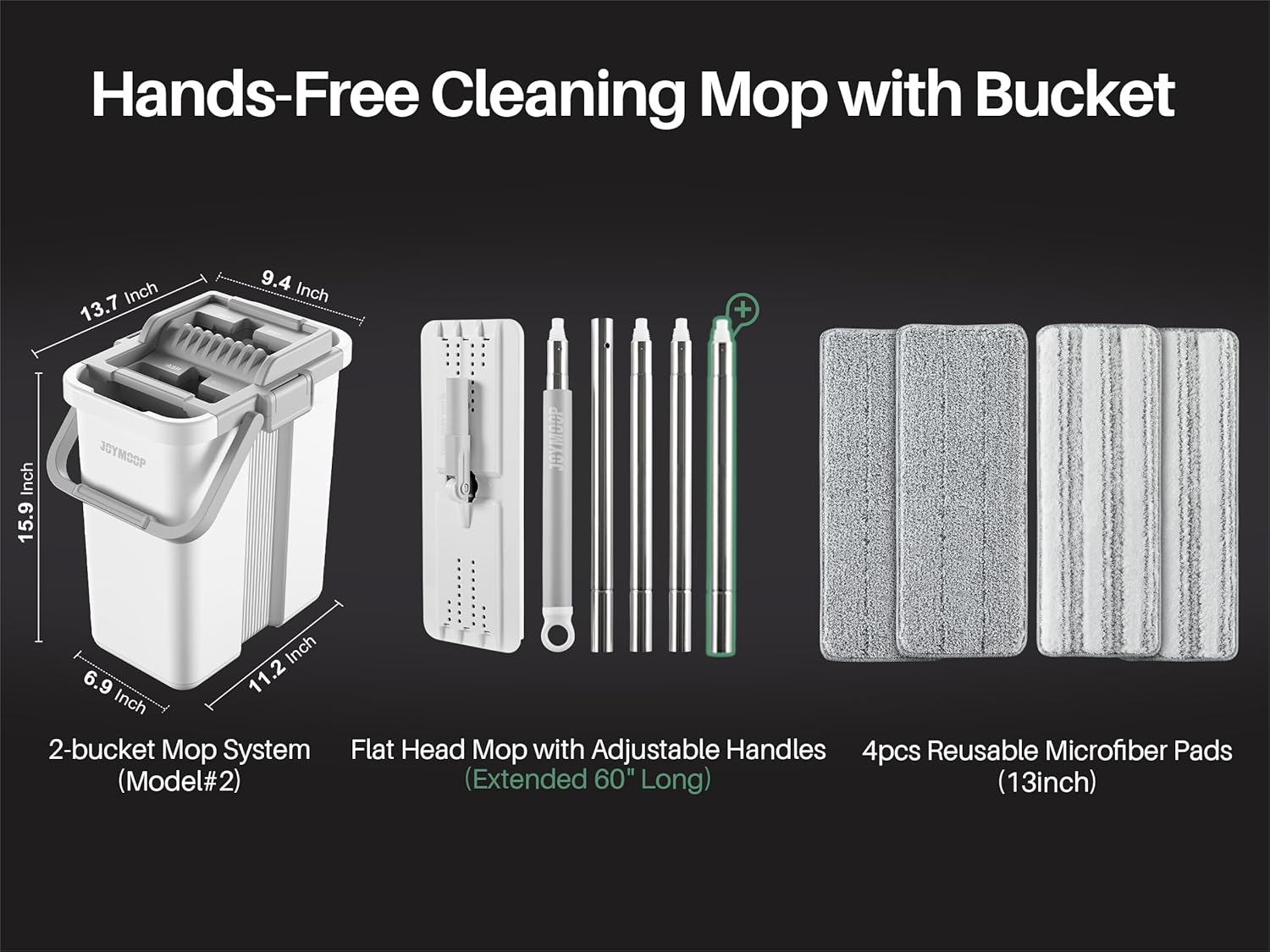 JOYMOOP Mop and Bucket with Wringer Set, Flat Squeeze Mop Flat Head, Dust Mops for Wall Cleaner with Long Handle, Hands-Free Microfiber Mops for Floor Cleaning - White