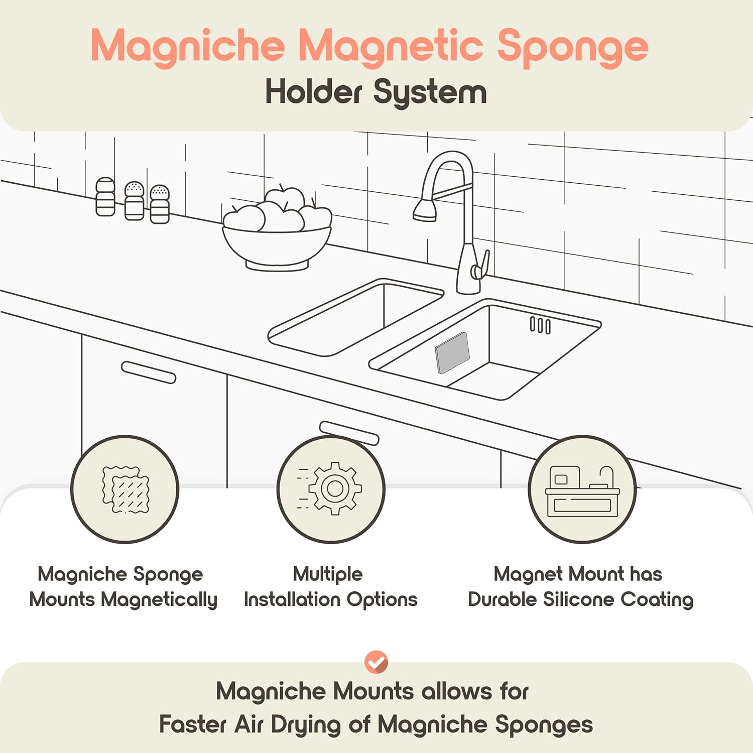 - π¦π ππ₯π§ π¦ππ‘π π’π₯πππ‘ππππ§ππ’π‘: Upgrade your kitchen with the Magniche magnetic sponge holder for kitchen sink. This magnetic sponge holder securely holds your dish sponge or kitchen scrubber, keeping your counter dry and clutter-free with easy sink access and fast drying.