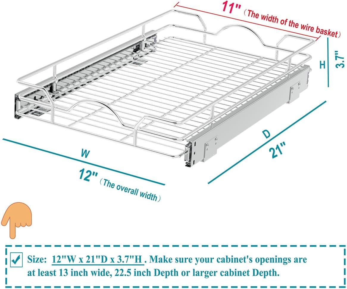 OCG Pull Out Cabinet Organizer (12" W x21 D), Pull out Shelves for Kitchen Cabinets, Slide Out Drawers for Base Cabinet Organization in Kitchen Bathroom Pantry, Bottom Mount, Chrome Finish