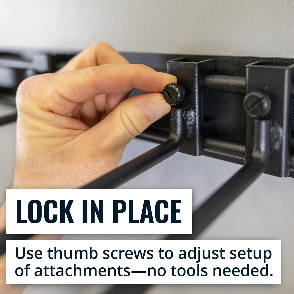 - INCLUDES 48" STORAGE RACK SYSTEM – Features modular wall hangers and wall shelves with expandable hooks that create a complete garage wall organizer. Dimensions: 48" wide with multiple tool storage organizer slots to secure yard tools, broom holder wall mount, and more.