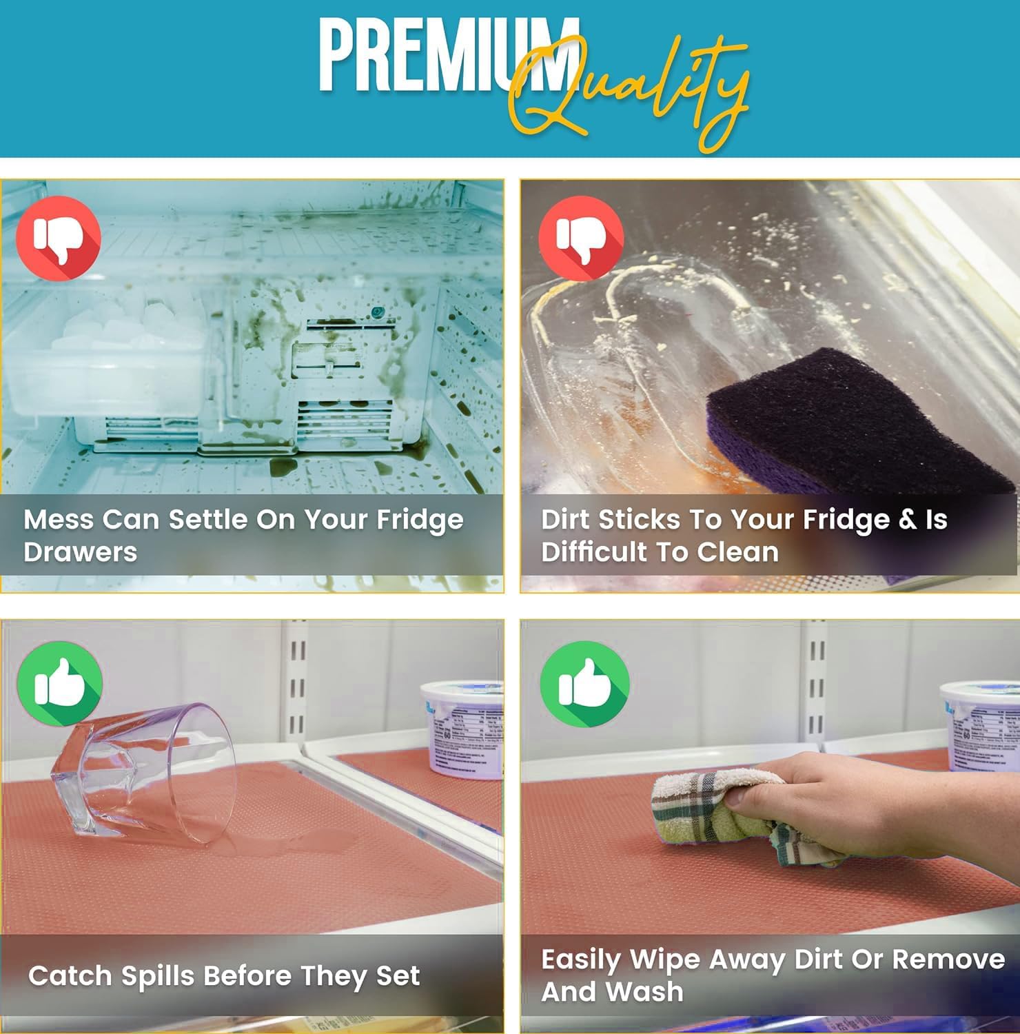 - KEEP YOUR FRIDGE CLEAN: Protect your fridge shelves against those annoying spills. Our refrigerator liners are made to keep your fridge in pristine condition and protect it against spills, drips and food getting stuck on your fridge shelves, saving you time and effort spent cleaning your fridge. Also works as refrigerator liners for shelves or fridge mats, making it one of the must-have household essentials for new homes