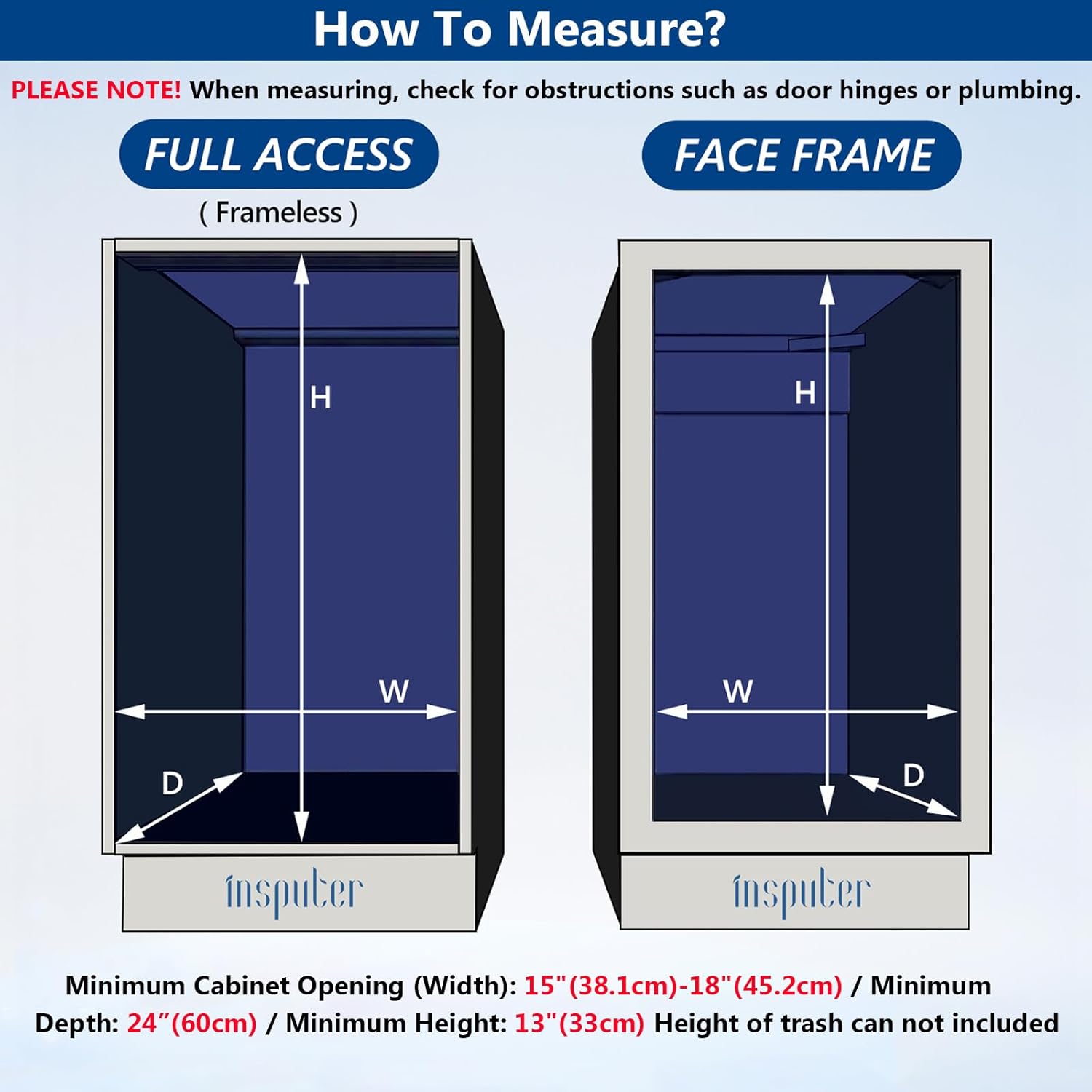 - Easy Installtion: No need to worry about installation difficulties! The under sink garbage can pull out has detailed instructions, installation videos and installation accessories, easy to understand! If you encounter installation problems you can contact us at any time, our customer service staff 24 hours online for you to solve any problem. Note: Please measure the cabinet to make sure the product fits the cabinet. Slide out trash can shelf size: 14.6"W x 22.04"D x 12"H, Fits minimum cabinet size: 15-18βW x 24"D(Should consider the height of the trash can.)