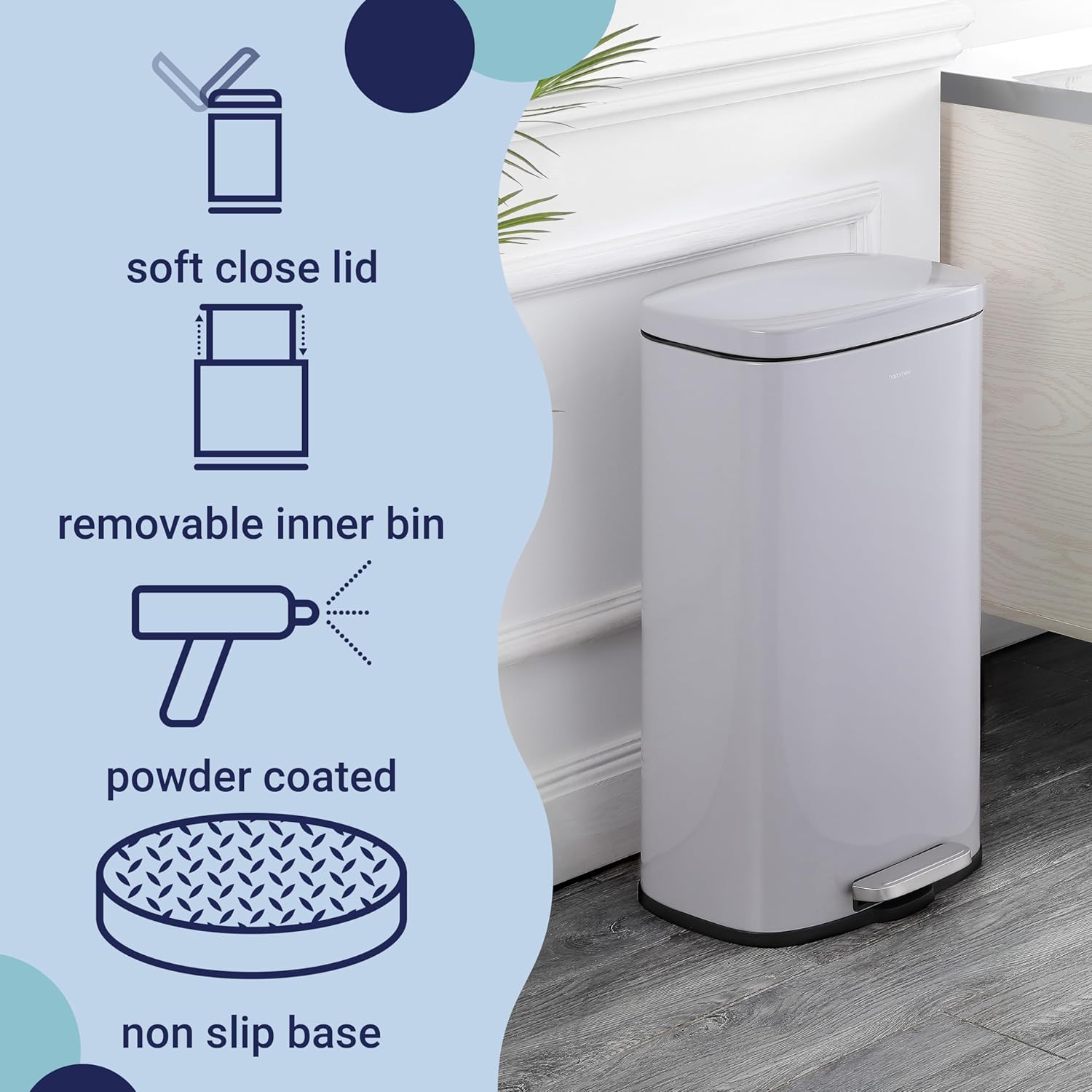 - Hands-free step pedal with a built-in damper to gently lower the lid