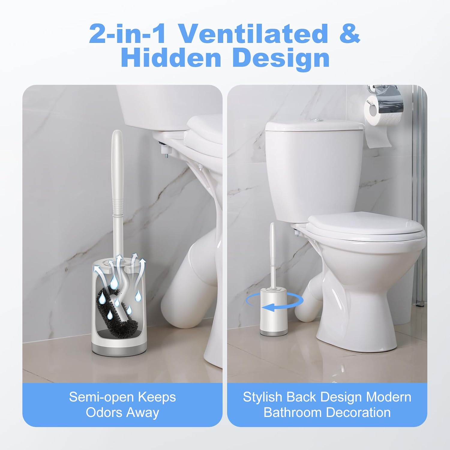 - SEMI-OPEN BRUSH HOLDER: Our toilet brushes for bathroom with holder features a half-open design that allows the brush to hang from the holder, water easily drips off bristles into the brush without drip on to your floor and evaporates quickly, which keep away from dirty floors and smelly odors