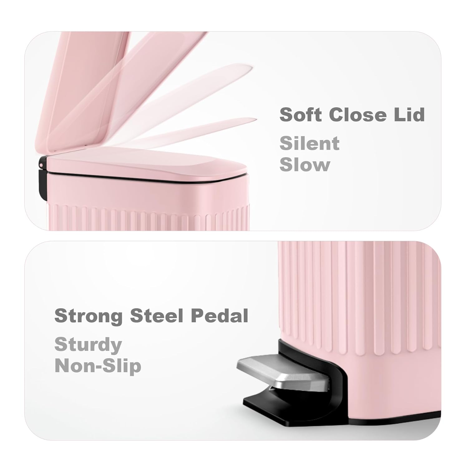 - Hands Free - Step design means you don't have to touch the can with your hands. The upgrade foot pedal is sturdy, functionally non-slip, more comfortable when pedaling it.