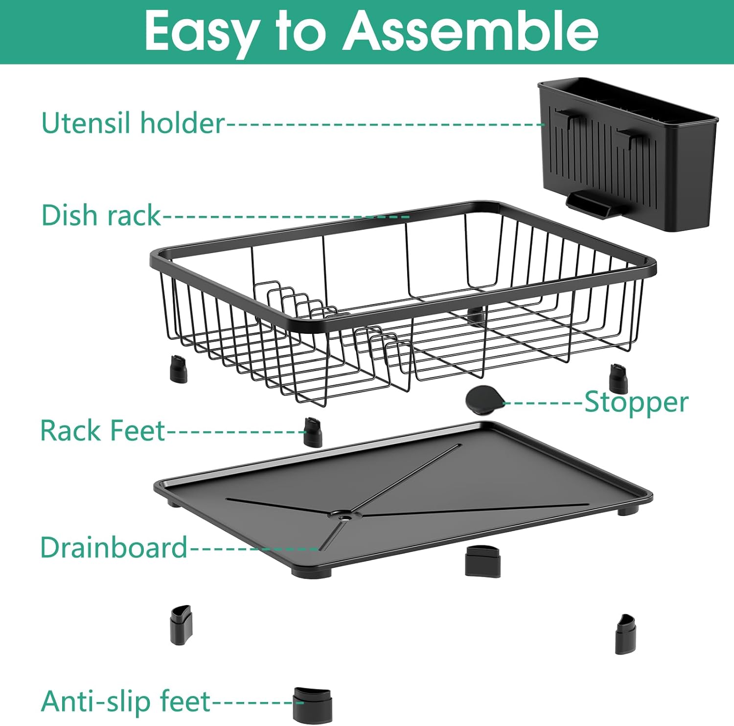 Dish Drying Rack - Space-Saving Dish Rack,Dish Racks for Kitchen Counter with Drainboard, Rustproof Dish Drainer with a Removable 4-Compartment Utensil Holder,Black