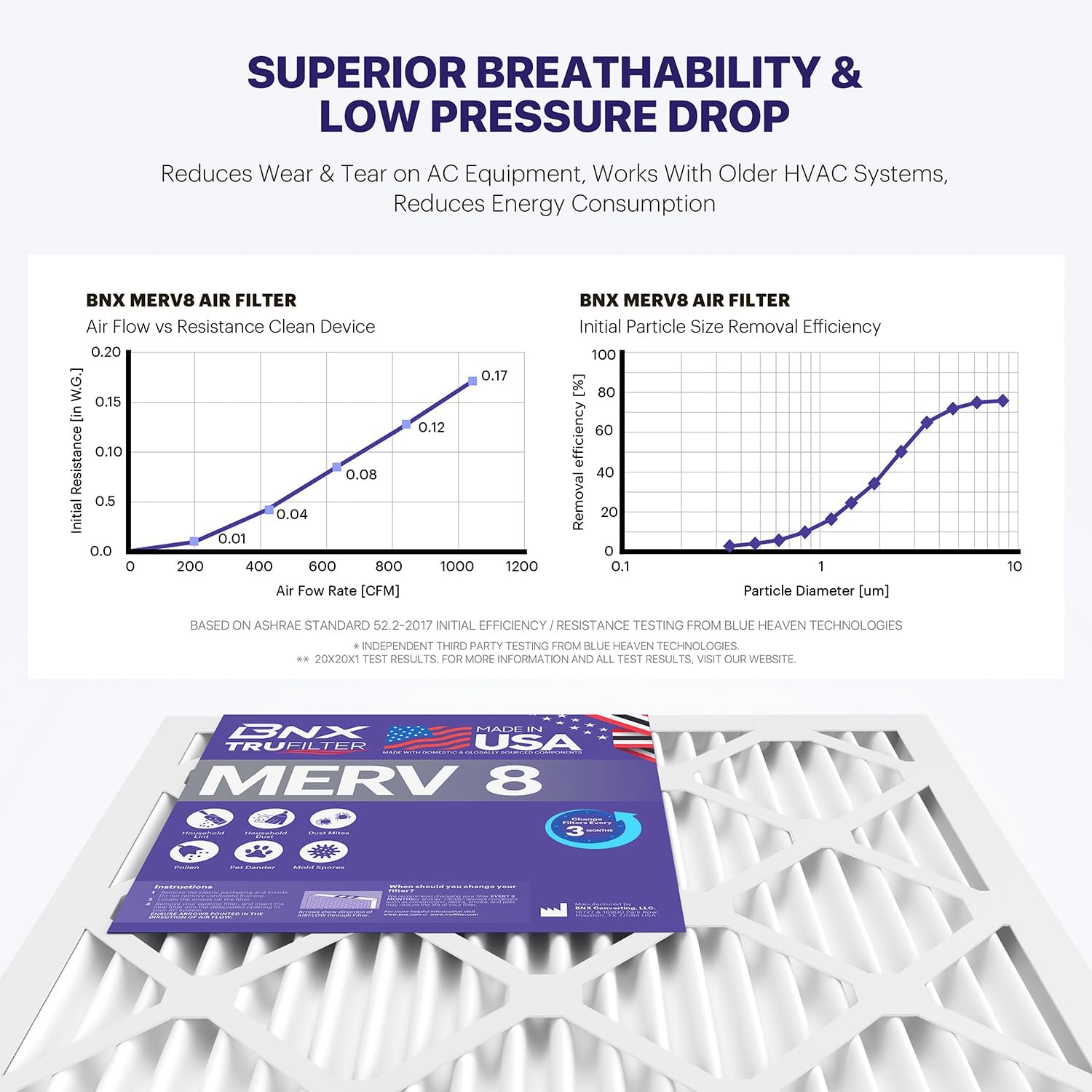 - SUPERIOR PERFORMANCE - The BNX MERV 8 100% synthetic air filter media outperforms standard fiberglass filters and adopts the latest in filtration technology to allow for industry leading superior low air flow resistance while maintaining the highest grade level of filtration.