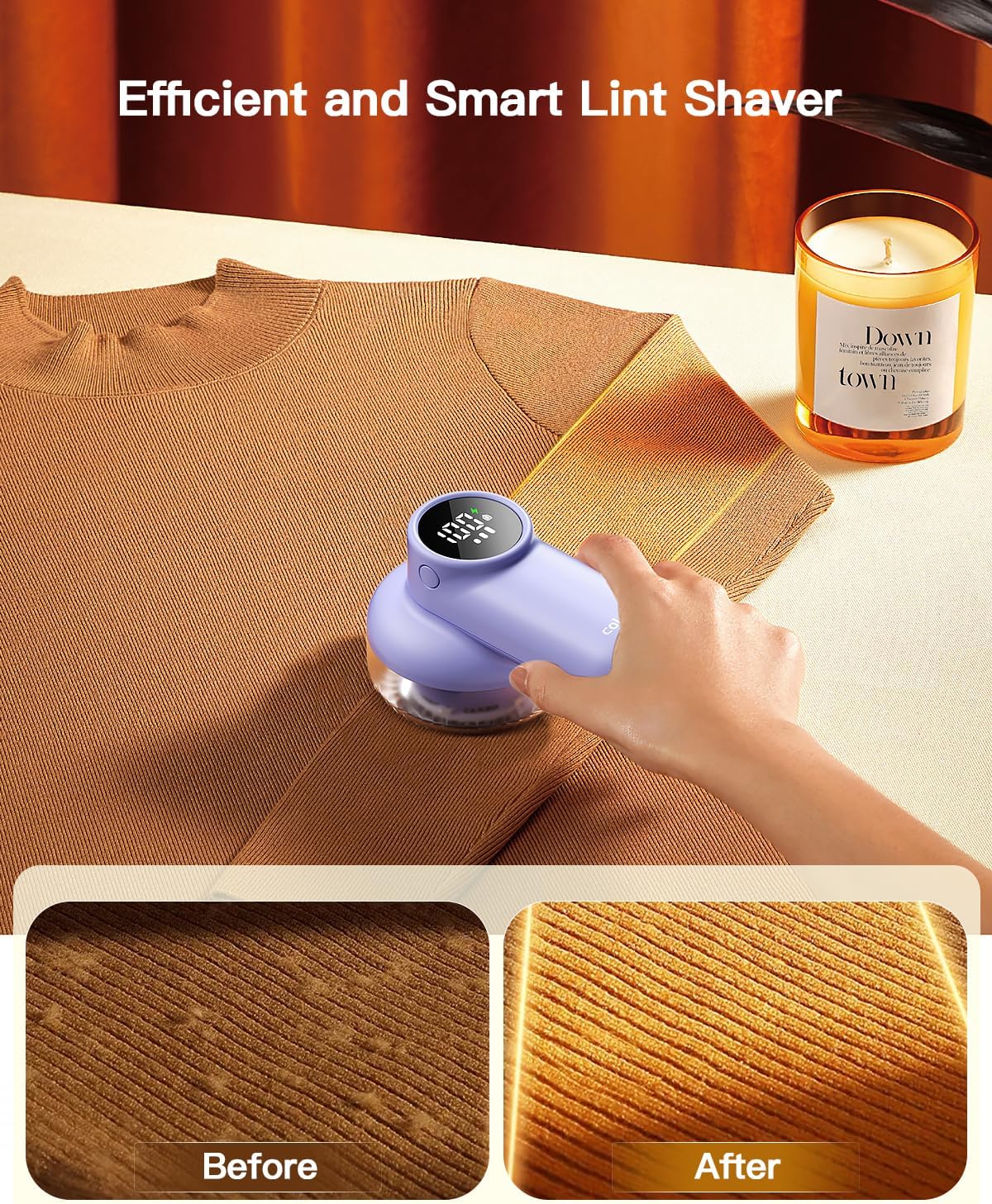 coldSky Rechargeable Fabric Shaver, Lint Shaver with Digital Display, Sweater Shaver with 6-Leaf Blades and Safety Lock, 3-Speeds Defuzzer Remove Fuzz, Pills from Clothes, Furniture, Blanket Purple