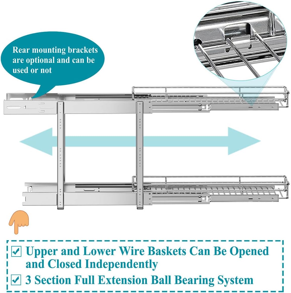 - Easy to Install: Comes with step by step installation manual,mounting template and all the hardware necessary for a quick, easy install. Both upper and lower wire baskets slide out independently on precision ball bearing slides so you can reach to your items easily and more quickly.