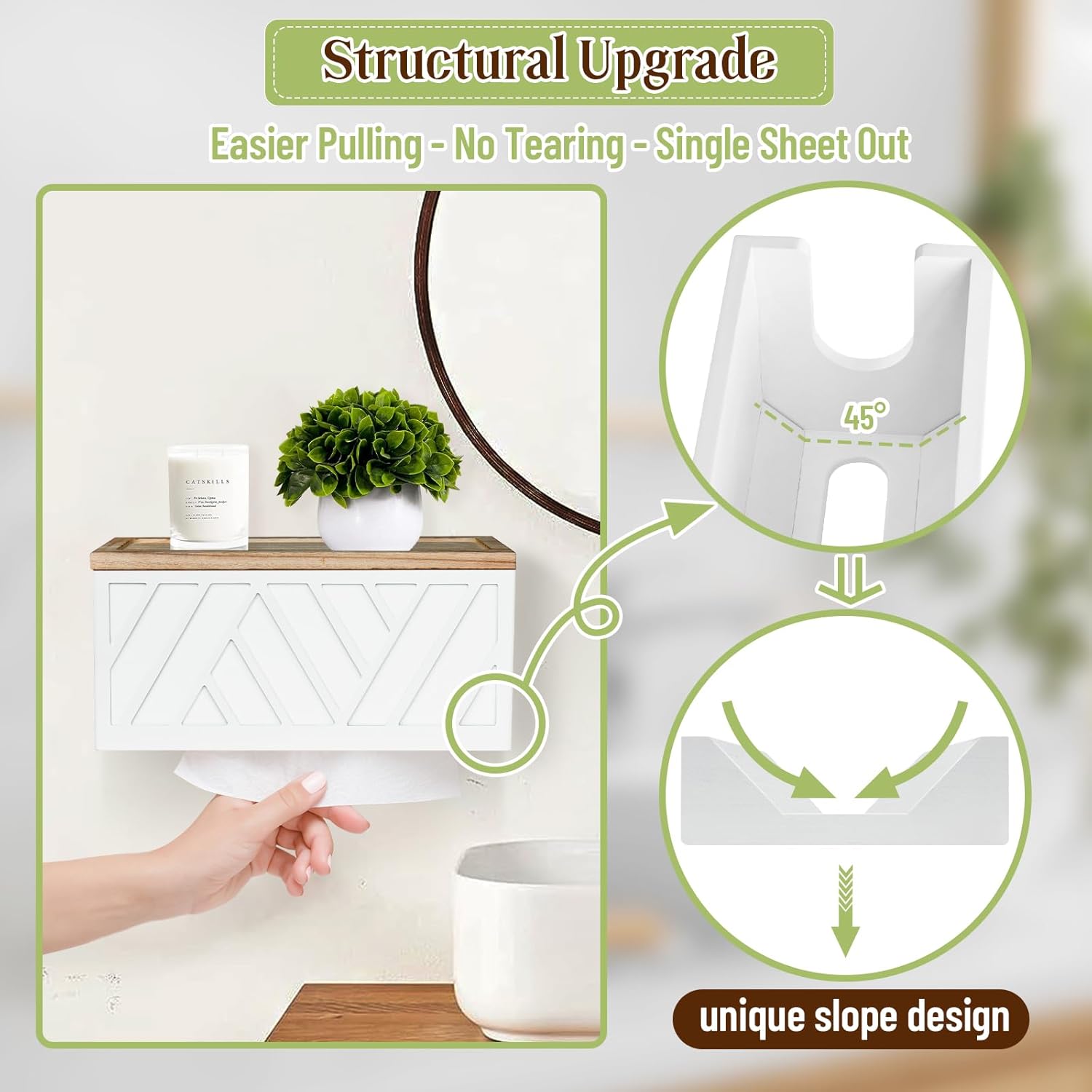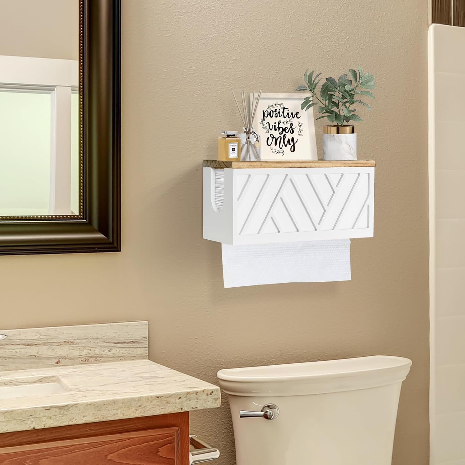 - 【Practical Paper Towel Holder for Farmhouse Decor】Our bathroom napkin dispenser is practical and beautiful. With wide and smooth opening bottom, our wall mount paper towel holder helps you easily access to the towel paper you need. In addition, the brown lid, exquisite carving, and white appearance of the bathroom paper towel holder adds a rustic home decor to the room.Whether on display on your countertop, or hang on your home wall, the bathroom paper towel holder is an eye-catching focus