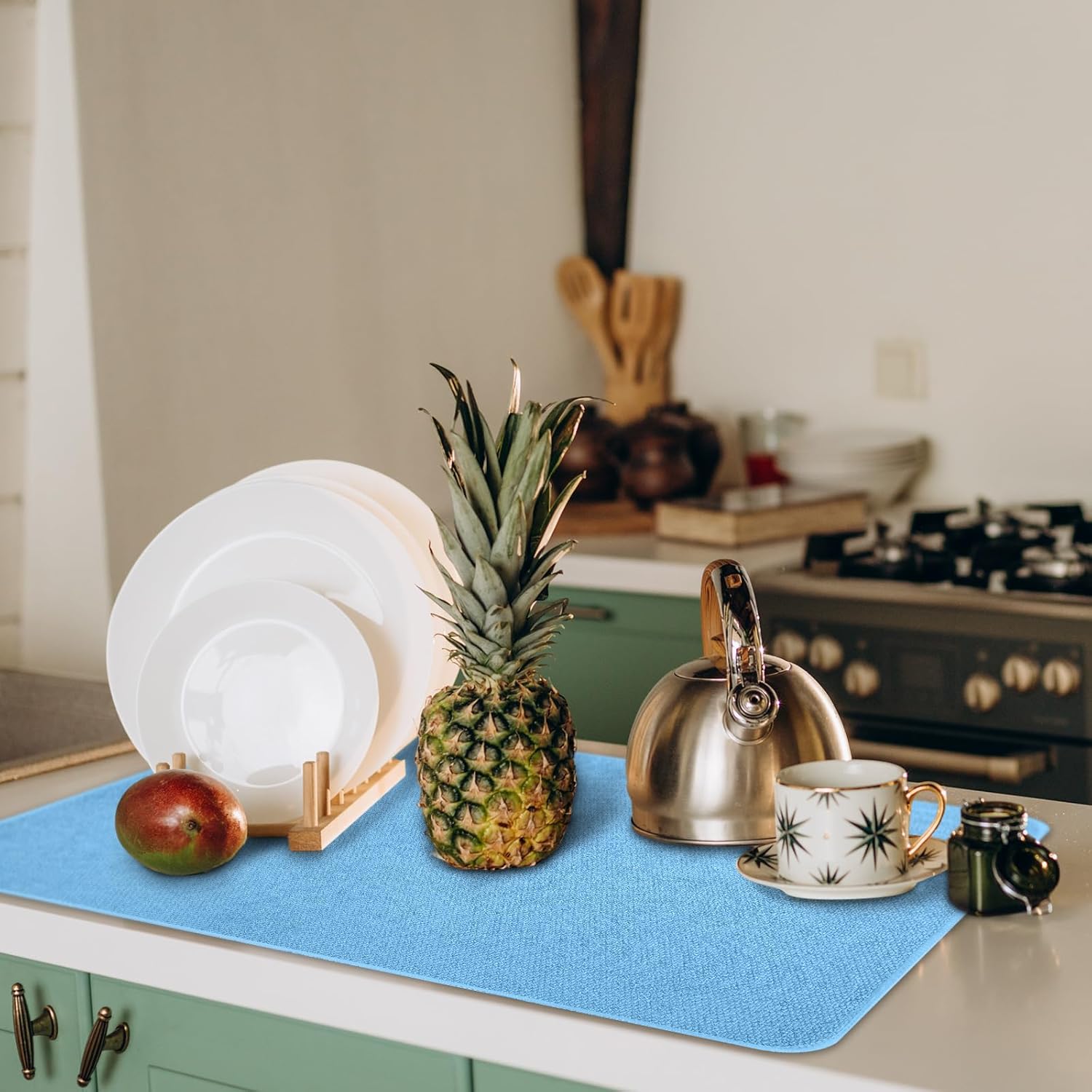 - Reliable Material and Attractive Design: get the ideal balance of functionality and style with our kitchen drying mats for dishes; Made from microfiber, these mats exhibit impressive water absorbent property, ensuring a dry, clean countertop; Their pleasing blue color will effortlessly blend with most kitchen interior, enhancing its aesthetics