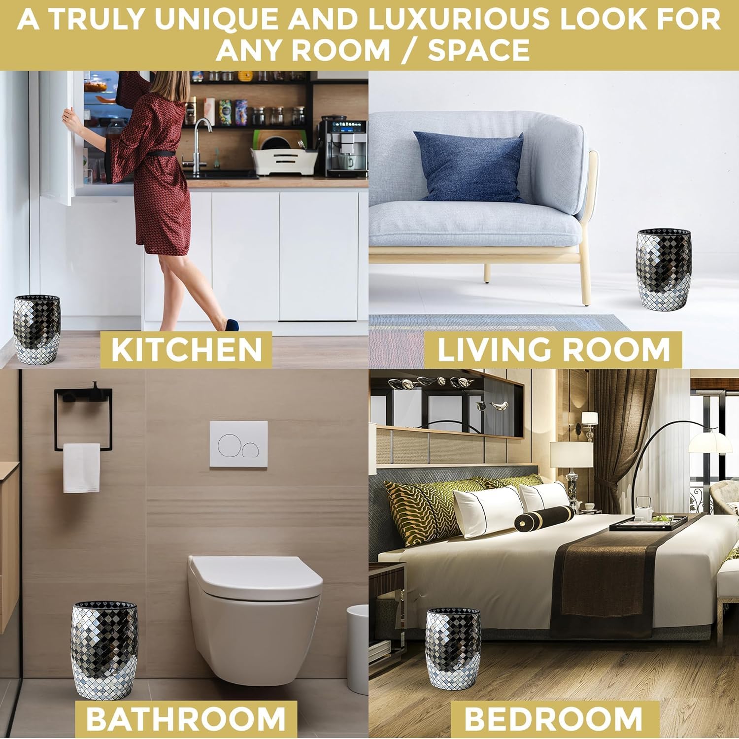 - Premium Small Garbage Can - Our decorative bathroom trash cans are hand-made with a beautiful mosaic glass finish for black/gold-themed decor. A must-have in your new house essentials for a luxurious bathroom experience.