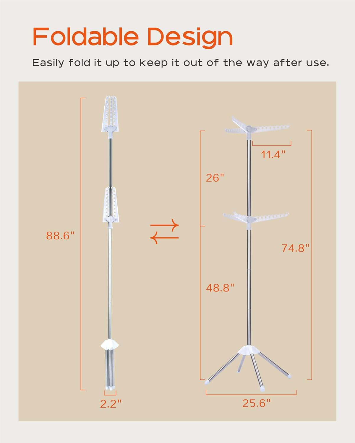 - [Foldable and Space-Saving] This vertical drying rack measures 25.6βD x 25.6βW x 74.8βH and takes up very little space. After use, simply fold the four legs and three drying rods into a smaller size: 2.2 "D x 2.2 "W x 88.6H, which can be leaned against the footrest, perfect for apartment laundry rooms or narrow spaces and corners.