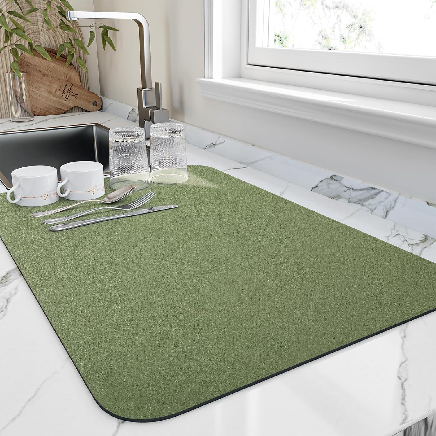 Dish Drying Mat for Kitchen Counter, Heat Resistant Drainer Mats with Non-slip Rubber Backed, Hide Stain Kitchen Super Absorbent Draining Mat, Easy to Clean Dish Rack Pad, Green 18"x24"